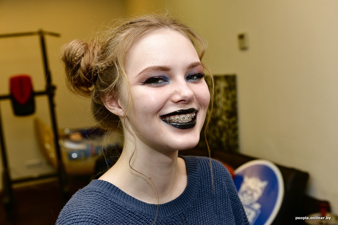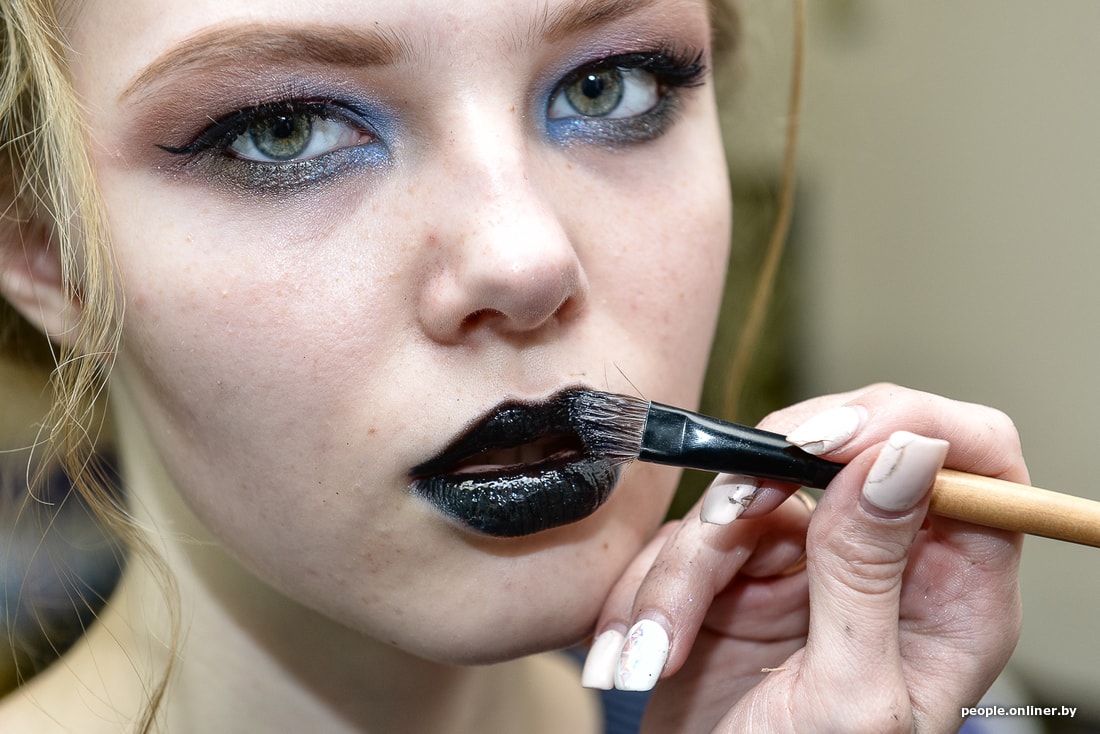 Теперь губы. Если нет черной помады, ее заменят черные тени. Темным карандашом делаем контур губ, сверху наносим черные тени. Закрепляем прозрачным блеском.