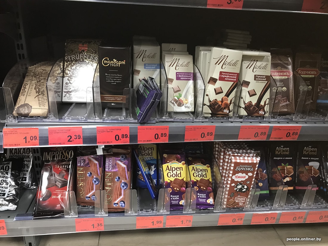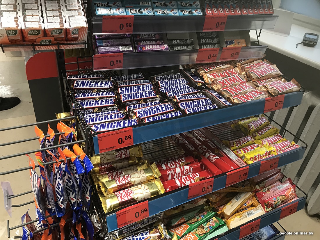Из того, что нужно в обычном «магазине у дома», здесь нет мясных изделий, крайне узкий ассортимент молочной продукции (несколько йогуртов и сгущенка), зато много собственных торговых марок, а самая длинная полка отдана алкоголю.