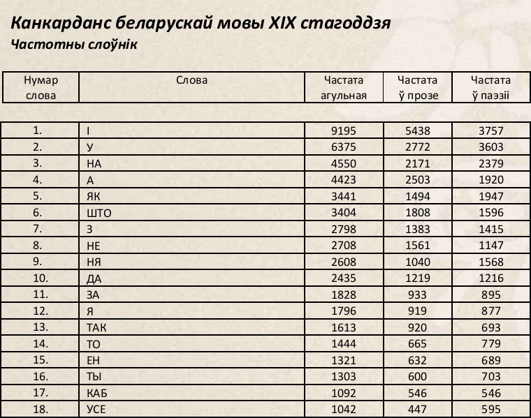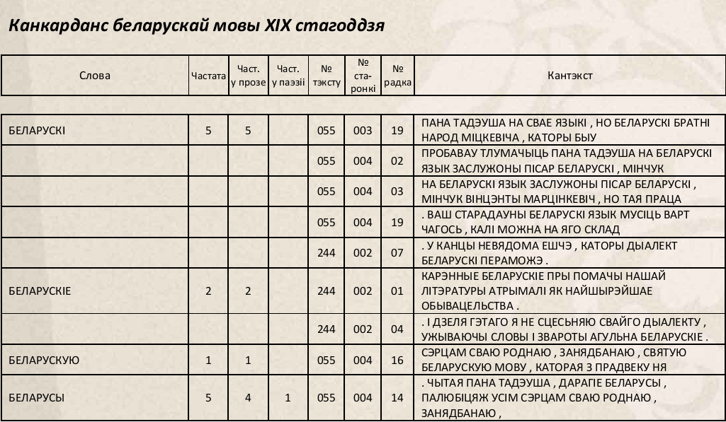 За прыгожым словам «канкарданс» хаваецца даведнік, у якім кожнае словаўжыванне (а такіх налічваецца 257 000) суправаджаецца тэкставай ілюстрацыяй і звесткамі пра яго частату і месцазнаходжанне. Акрамя таго, карыстальнікам даступны паказальнік слоў, шэсць частотных слоўнікаў, адваротны слоўнік і некалькі аўтарскіх канкардансаў (В. Дуніна-Марцінкевіча, А. Ельскага, К. Каганца і К. Каліноўскага).
