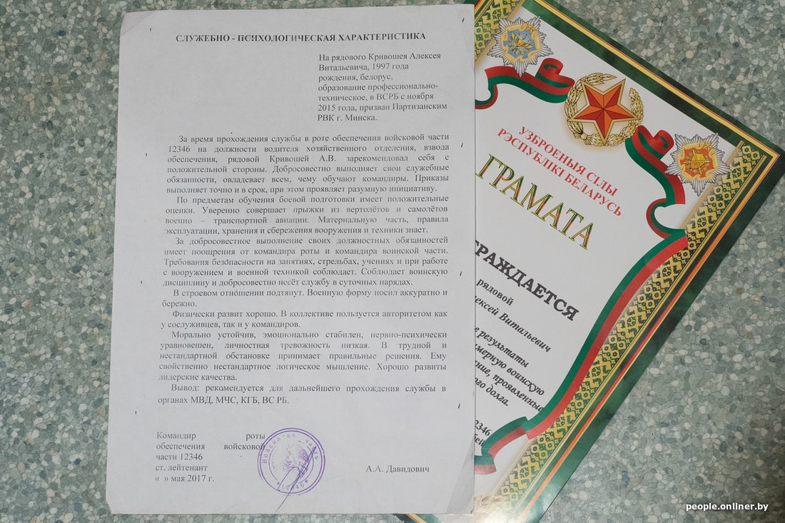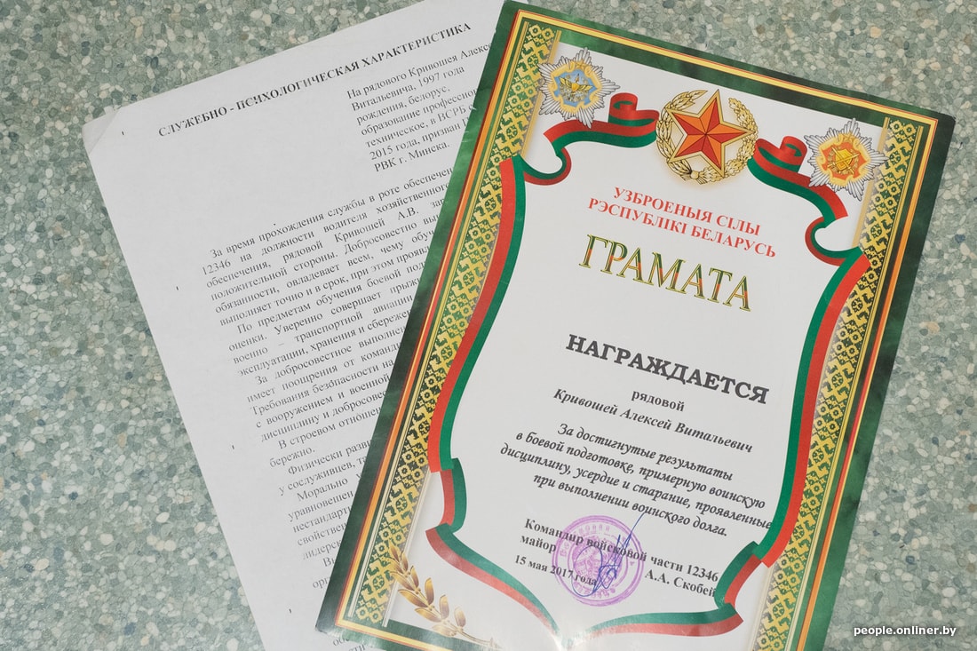 Наталья Васильевна показывает грамоту от командира войсковой части и характеристику. Парня хвалили, отмечали, что служил хорошо, дисциплинированный и ответственный. Кроме того, по мнению командира, Леша мог служить дальше в Вооруженных силах или в МЧС, МВД.