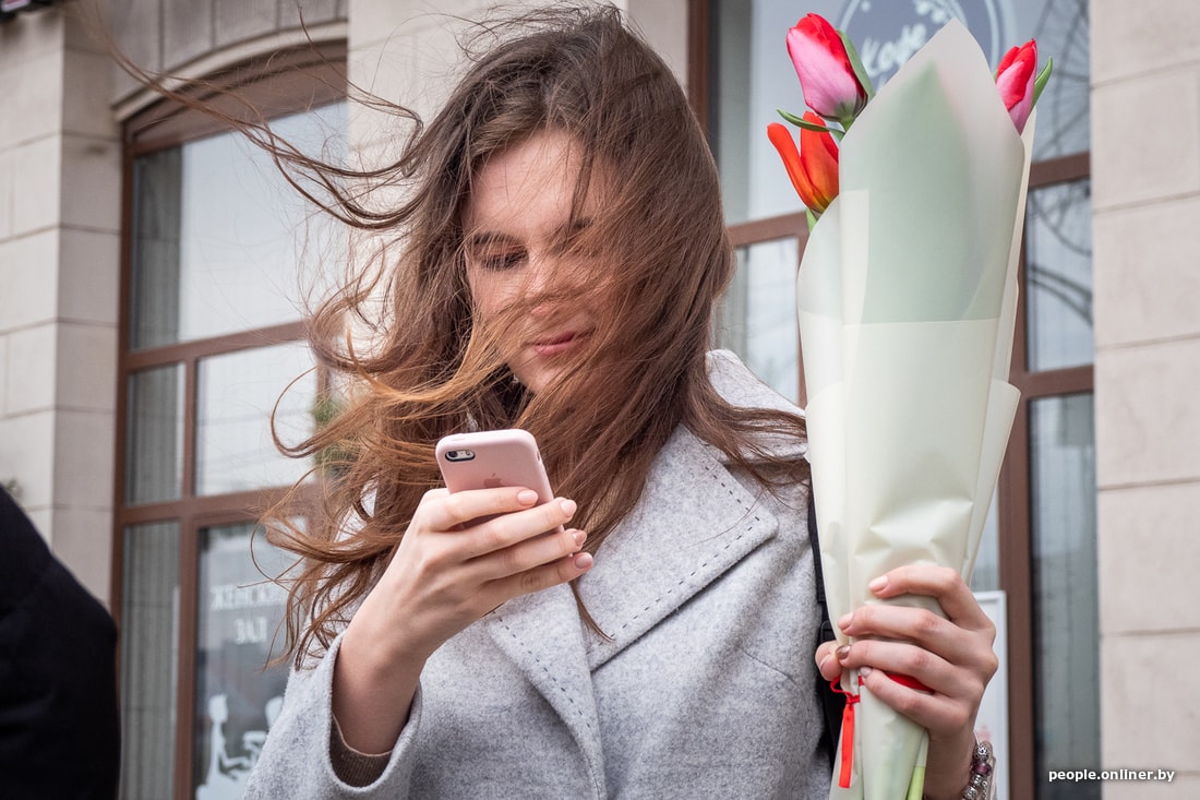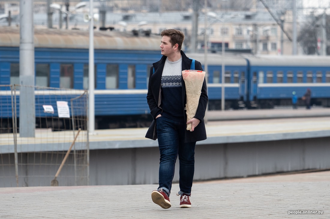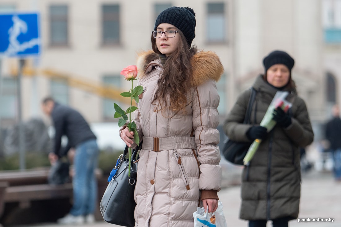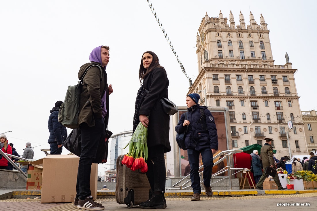 Мужчина с брутальным взглядом несет нежный букет из мимозы. Ничего комментировать не желает — «нет времени». Но белорусские женщины так просто не сдаются — перекрываем ему дорогу:
