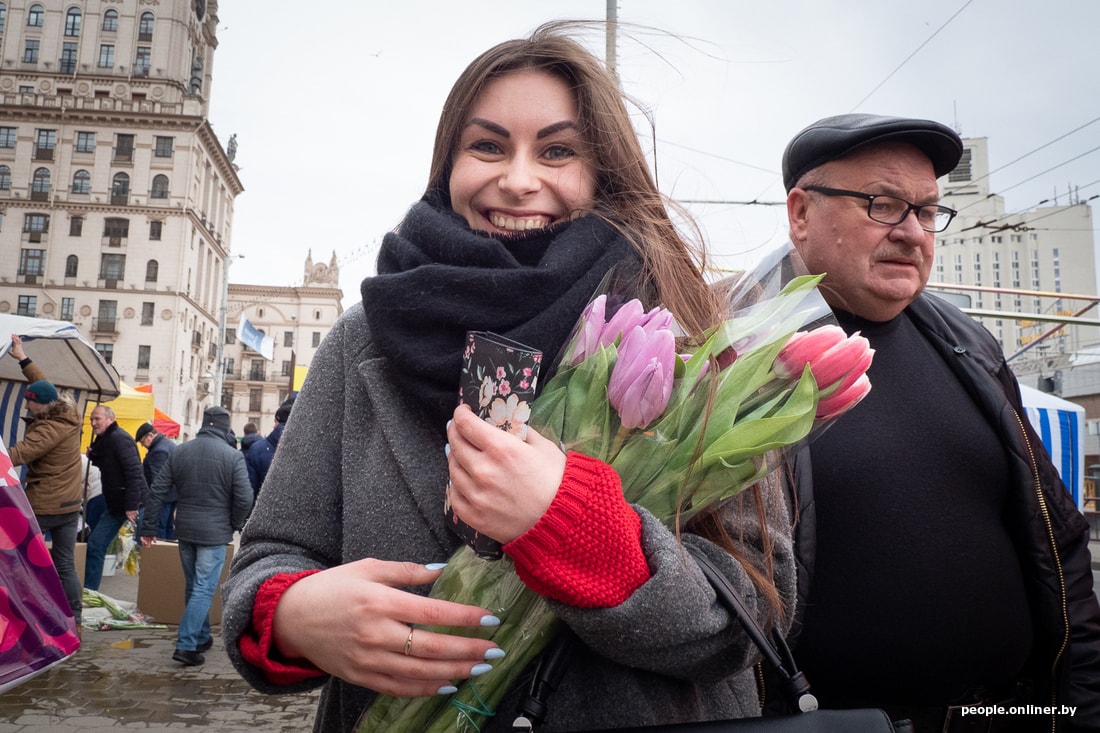 В предпраздничном Минске очень тяжело остаться без подарка. Продавцам такой достался от погоды. Можно пытаться удержать цветы на столе, но все равно проиграешь — ветер категорически настроен разнести палатки. Это нестрашно: товар почти раскуплен. Значит, выходные обещают много довольных женщин. Теперь можно уходить на законный отдых со спокойной душой.