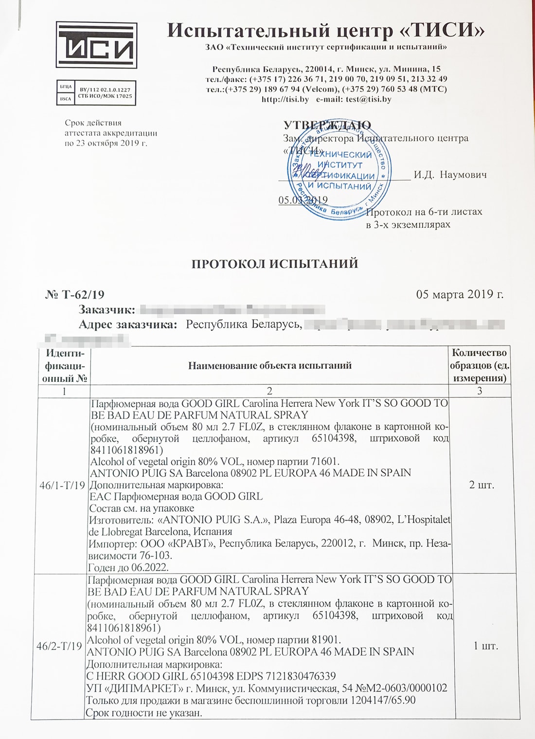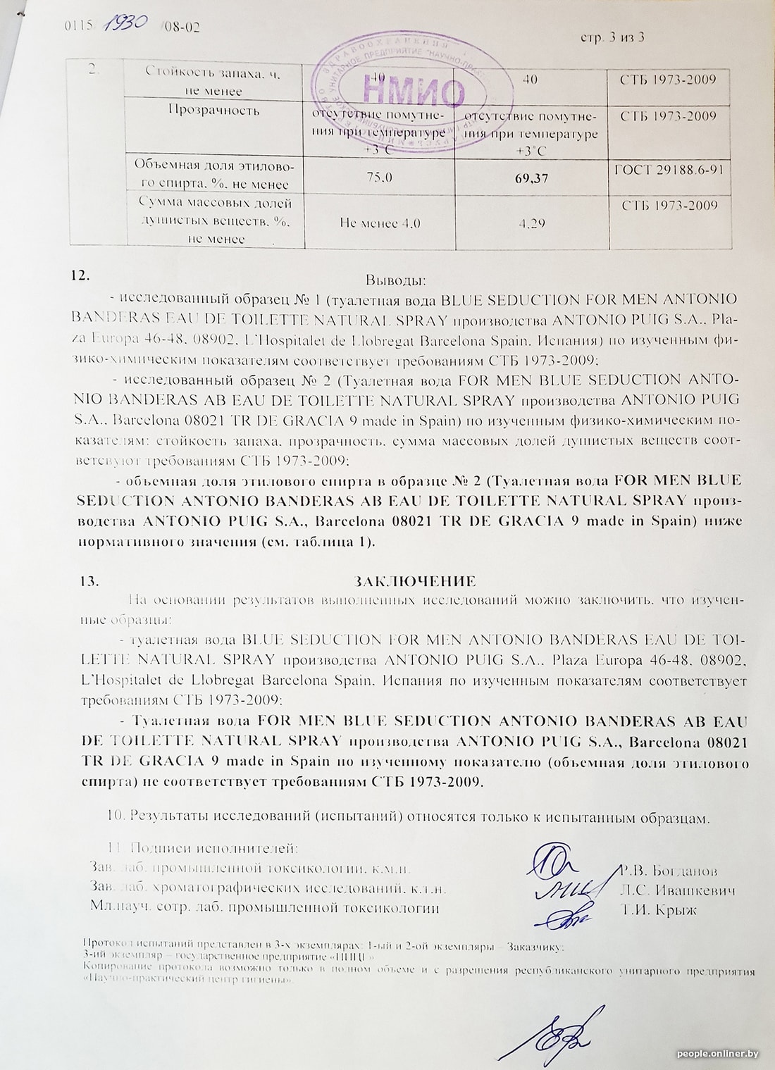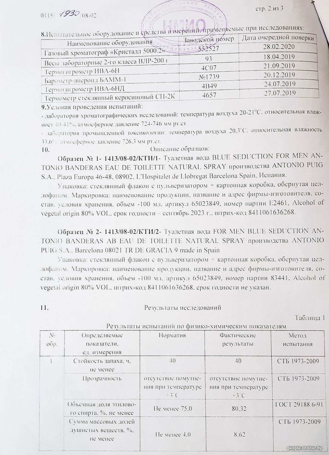 Результаты исследований отражены в протоколе испытаний №0115/1930/08-02 от 06.03.2019 ГУ РНПЦ. Как указано в заключении, образец №2 не соответствует требованиям СТБ 1973-2009 (по объемной доле этилового спирта), а сумма массовых долей душистых веществ в образце №1 в два раза больше — это к вопросу, почему копия пахнет беднее и выветривается быстрее.