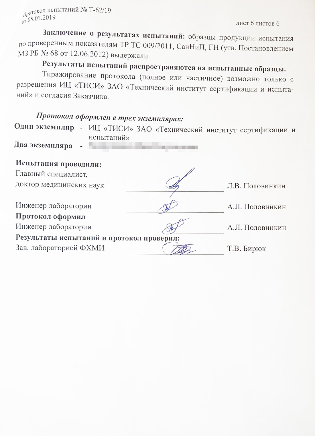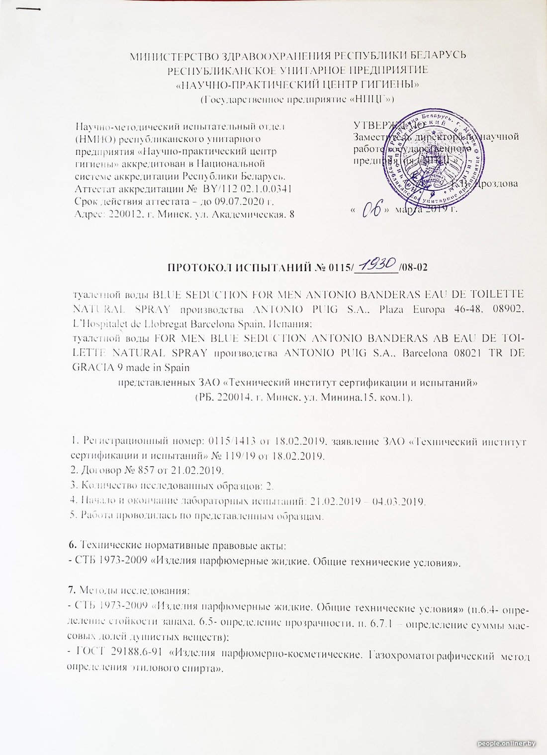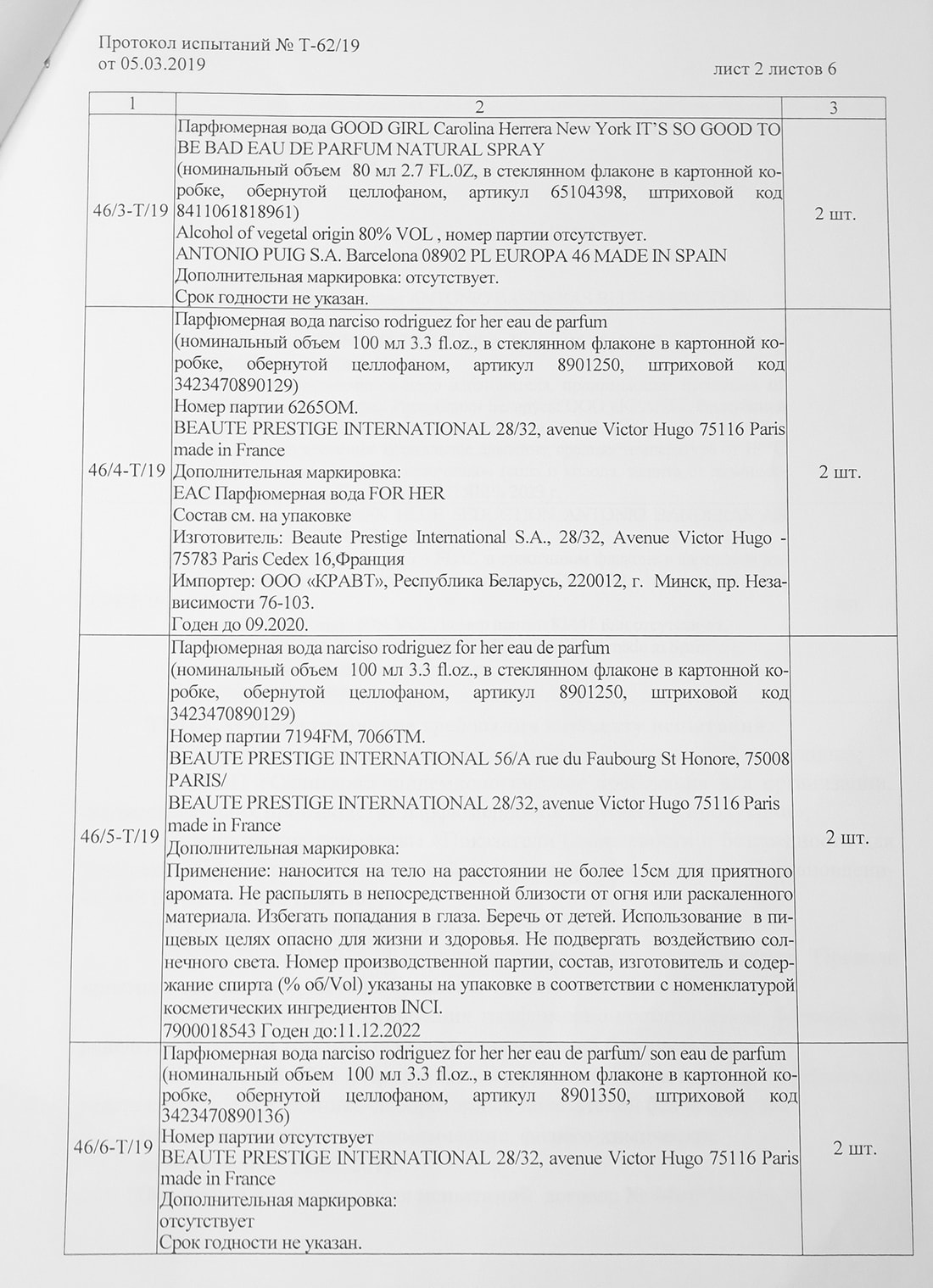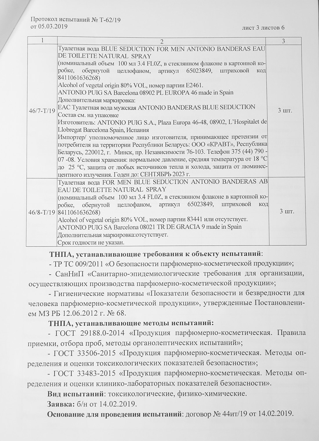 Результаты исследований отражены в протоколе испытаний №0115/1930/08-02 от 06.03.2019 ГУ РНПЦ. Как указано в заключении, образец №2 не соответствует требованиям СТБ 1973-2009 (по объемной доле этилового спирта), а сумма массовых долей душистых веществ в образце №1 в два раза больше — это к вопросу, почему копия пахнет беднее и выветривается быстрее.