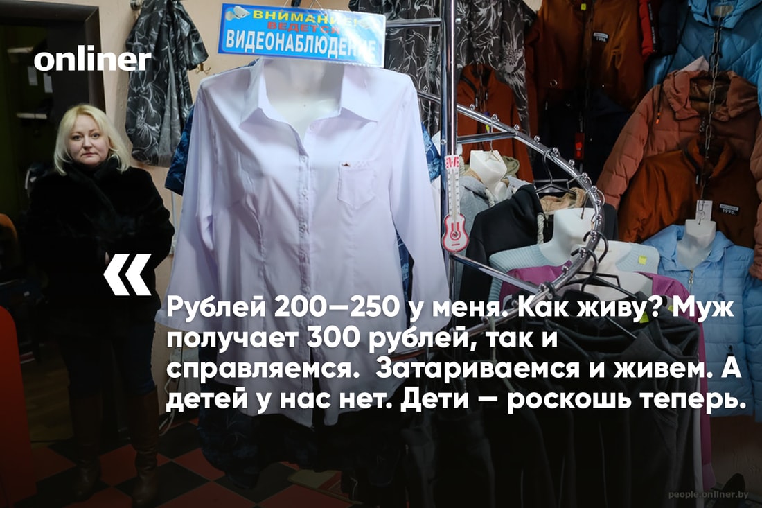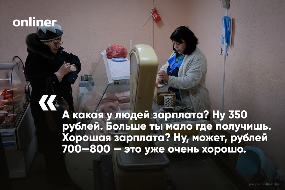 Какие зарплаты хорошие? Ой, ребята, как и в Минске. Цены-то везде одинаковые. Или вы думаете, что у нас дешевле? Точно так же хотелось бы и 1000 рублей получить, только это вряд ли когда-нибудь случится. Хоть бы 600 — это для нас был бы праздник большой: мы без выходных 300 с небольшим имеем. Люди-то готовы работать, но где?