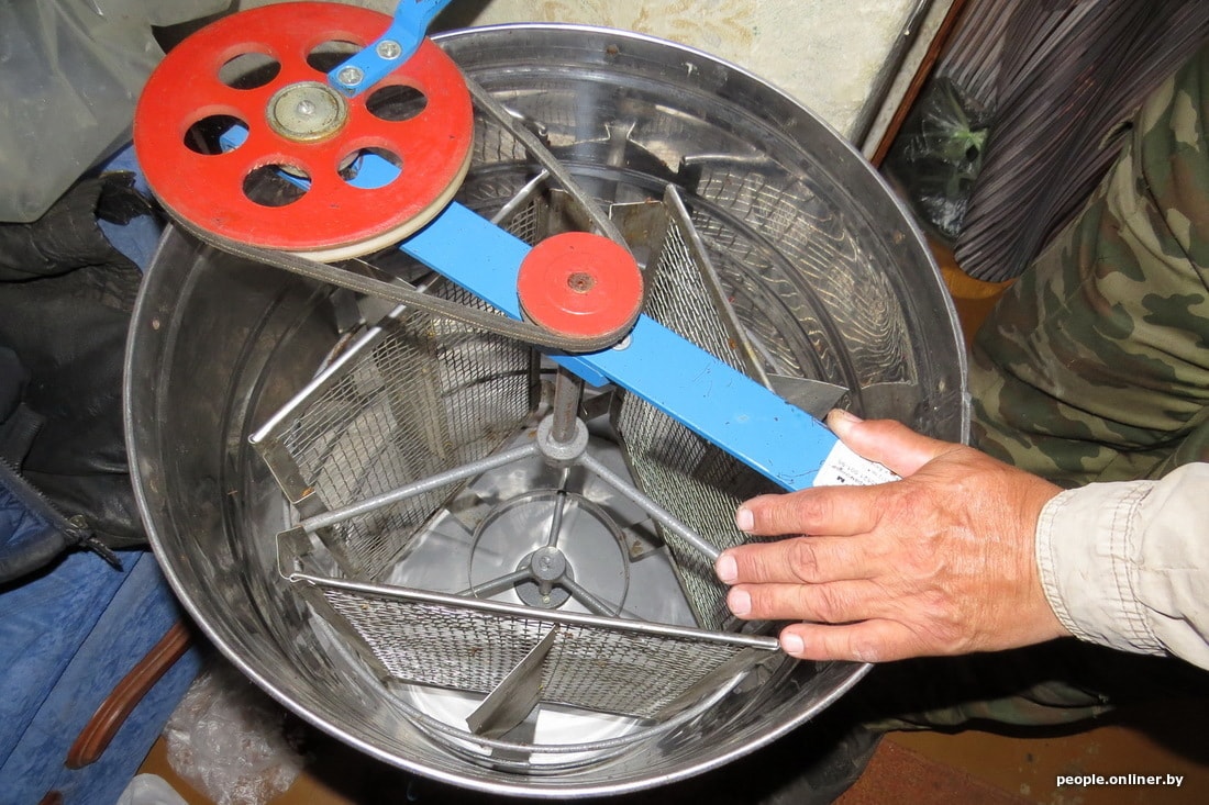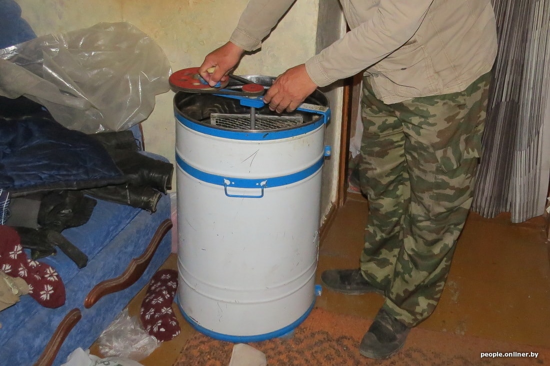 Кстати, вот как выглядит медогонка для извлечения меда из сот. Вообще-то, она нужна тем, у кого есть ульи. У Петра их теперь нет, так что агрегат простаивает. С виду что-то вроде стиральной машины «Рига». Внутри — решетчатые ячейки. Туда заряжаются рамки с медом, извлеченные из улья. Крутишь ручку — конструкция вращается, мед под воздействием центробежной силы выдавливается из сот и стекает вниз. Там краник, через него мед разливается по емкостям для хранения.