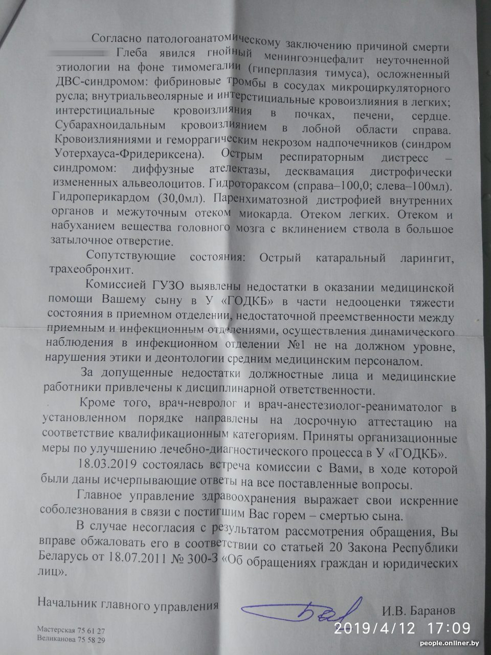 16 февраля в Гомельской областной детской клинической больнице умер двухлетний Глеб. Мы подробно рассказывали про этот случай со слов родителей мальчика. Тогда, а также в последующие четыре месяца получить комментарии медиков нам не удалось. А недавно о ситуации все же высказался руководитель облздрава Игорь Баранов. Сделал он это в интервью газете «Гомельская правда».