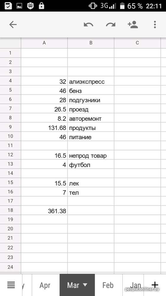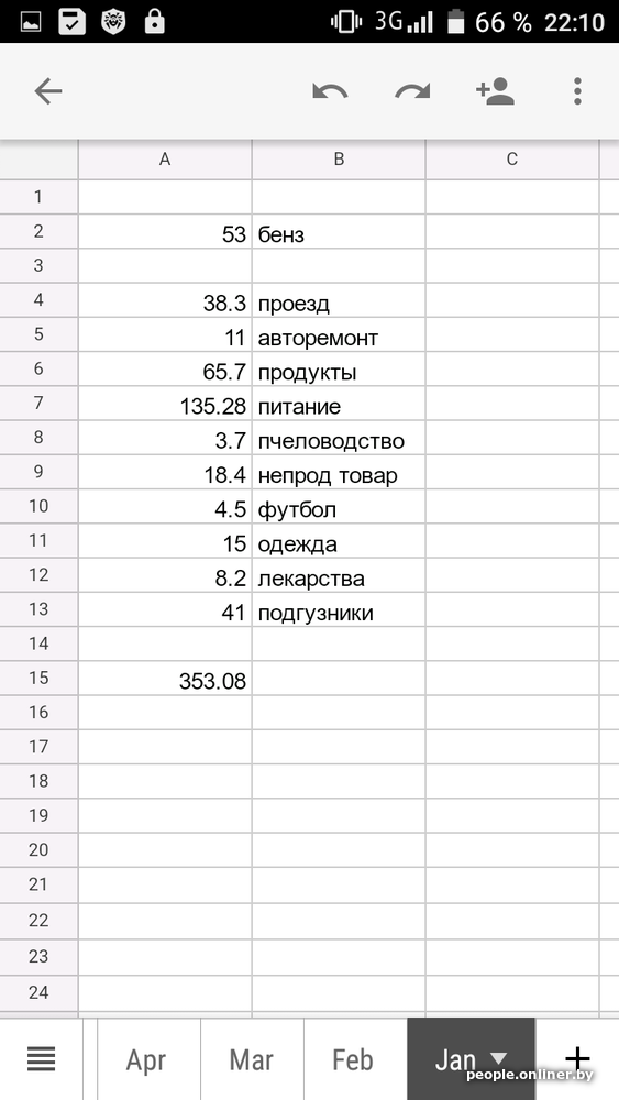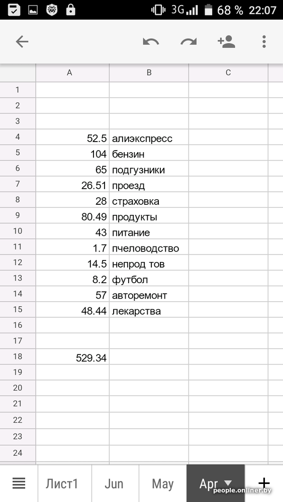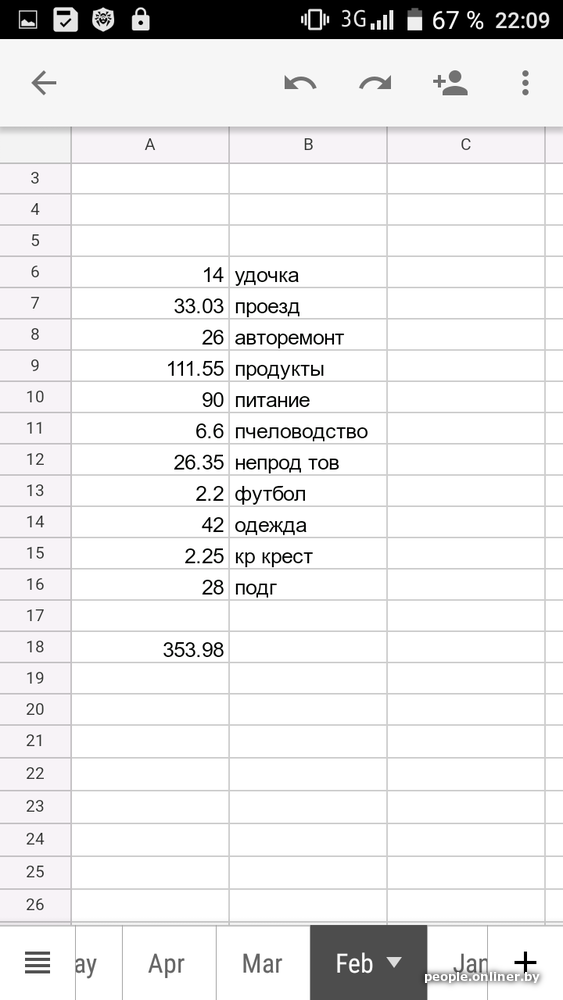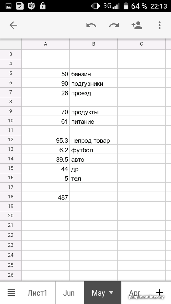 — Приведу цифры. В январе было потрачено 353 рубля (бензин — 53, стиральный порошок — 13, проезд — 38,3, продукты — 65,7, детское питание — 135,28, другие товары — 8,1, плата за футбольный зал — 4,5, одежда — 15, лекарства — 8,2, подгузники — 41), — перечисляет он. — В апреле вышло больше — 529 рублей (заказы на AliExpress — 52,5, бензин — 104, подгузники — 65, страховка — 28, продукты — 80,49, детское питание — 43, другие товары — 15,2, футбол — 8,2, авторемонт — 57, крем для ребенка — 48). А в мае я потратил 487 рублей.