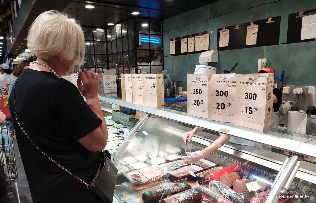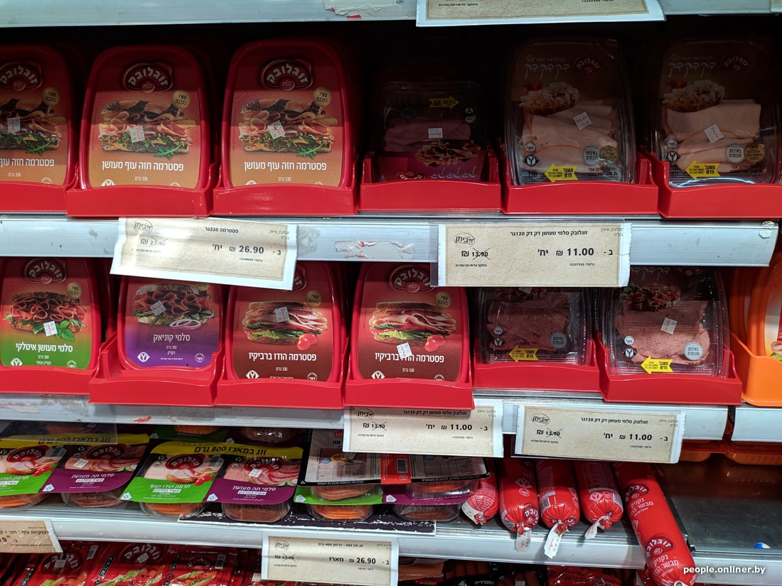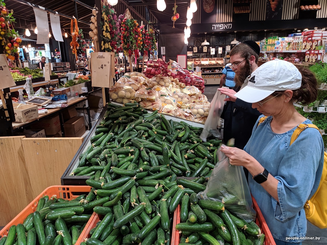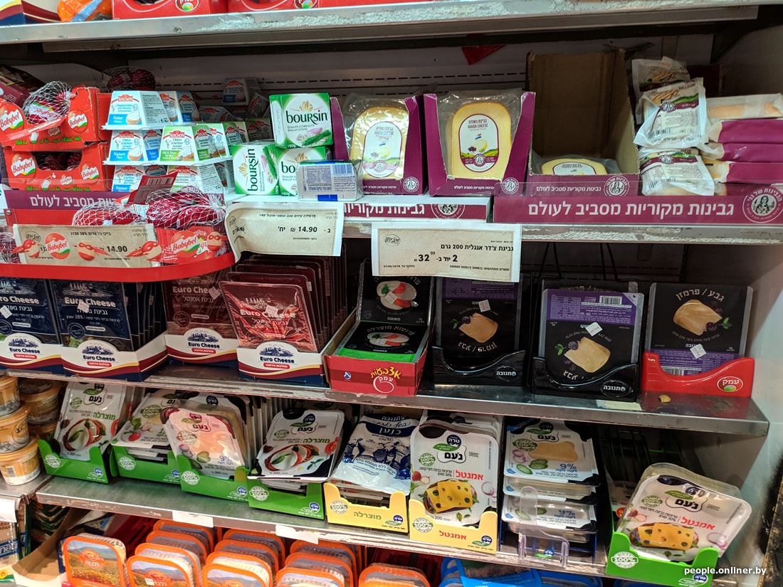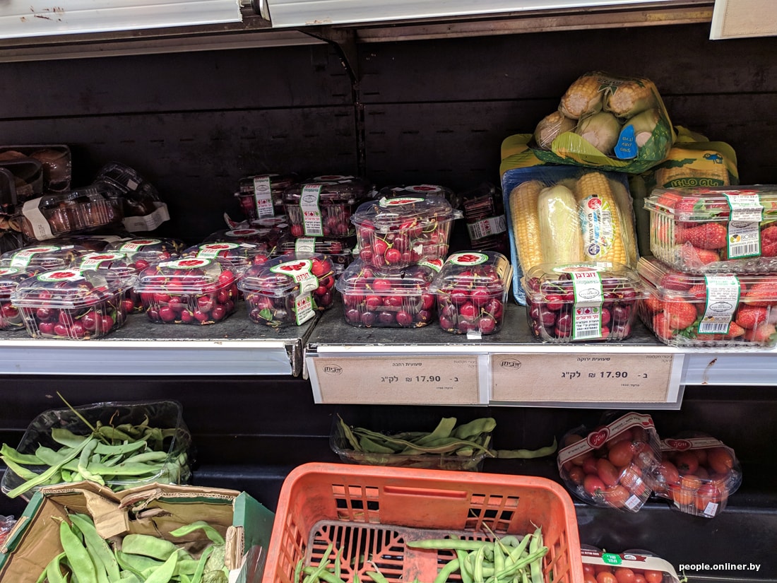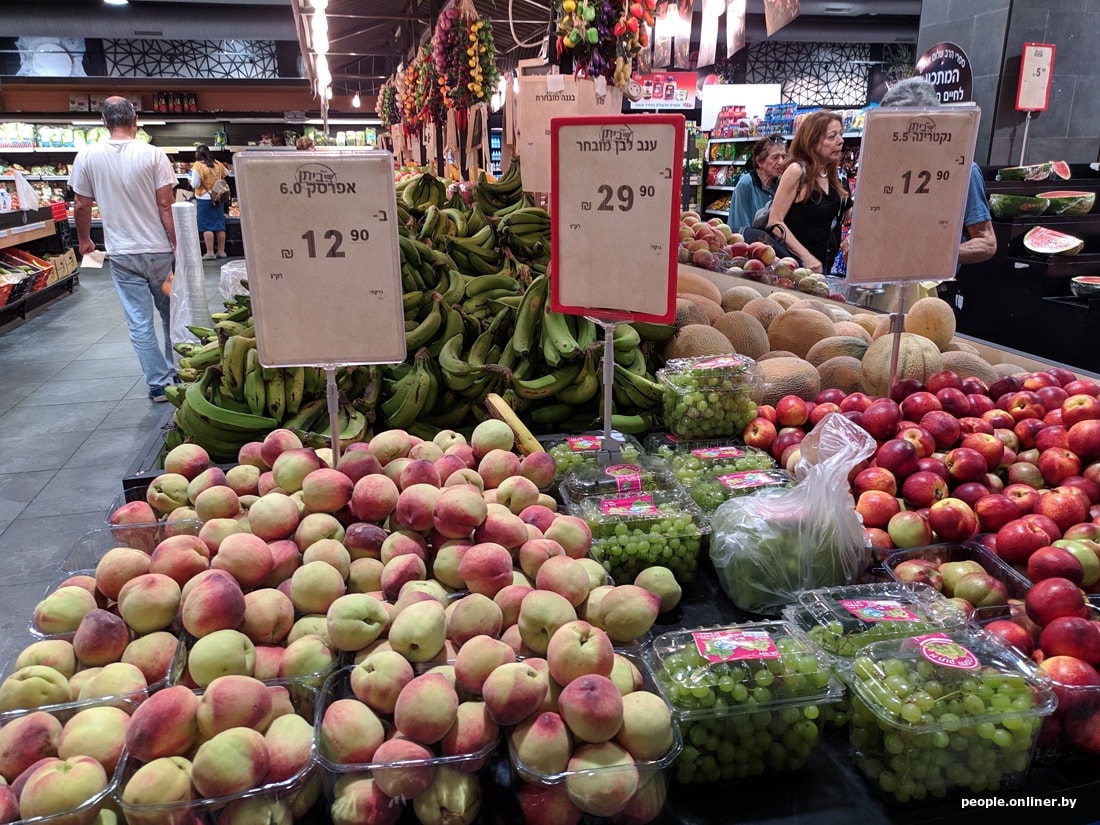 В супермаркетах цены для белоруса тоже приличные. Вот, например, скромный набор: яйца, ветчина, сосиски, хумус, семечки, корнишоны, хлеб, йогурт, сыр, кофе, вода, кинза и лук. Такая корзинка в Тель-Авиве обойдется в 95 рублей. Теперь пофантазируйте, на сколько походов в израильский магазин хватит вашей зарплаты.