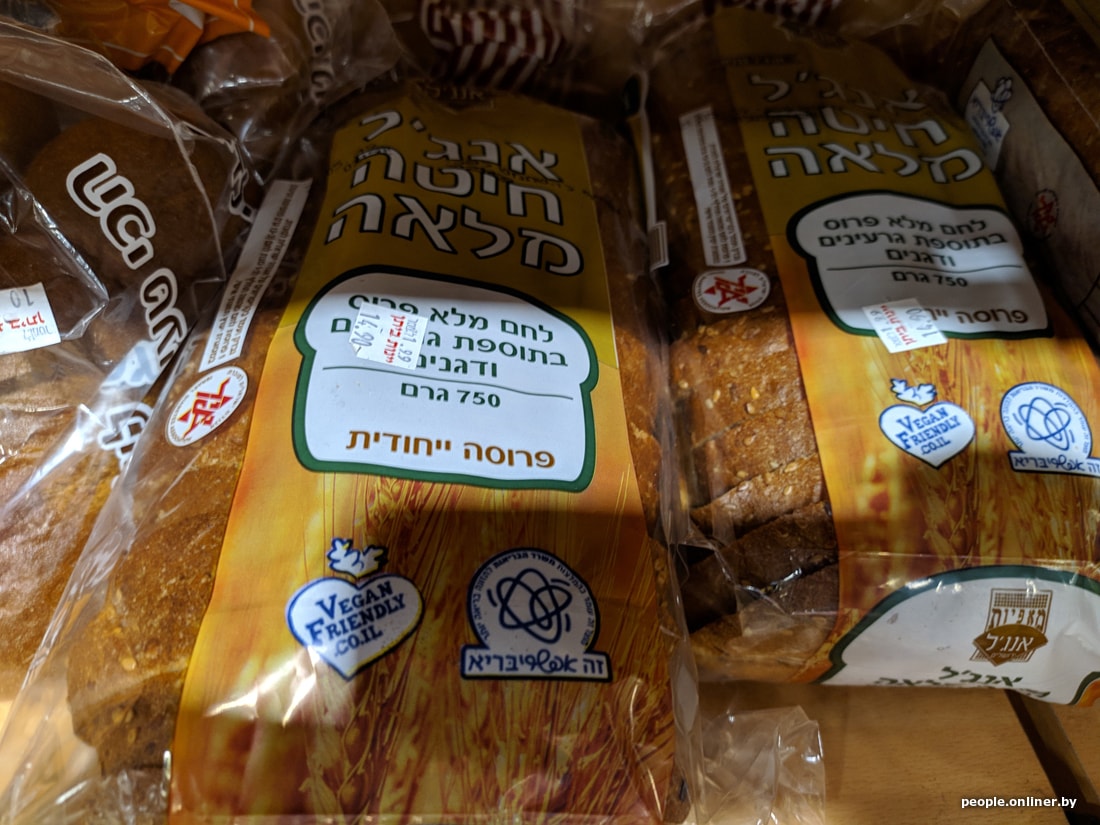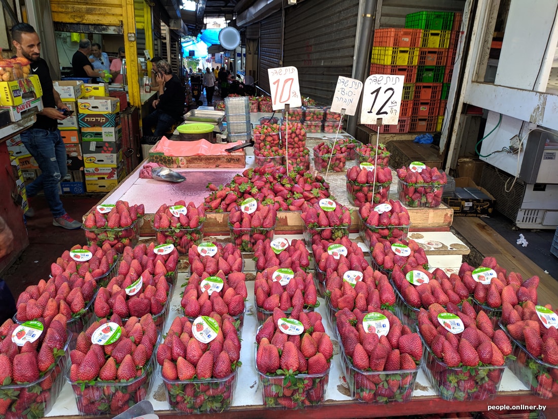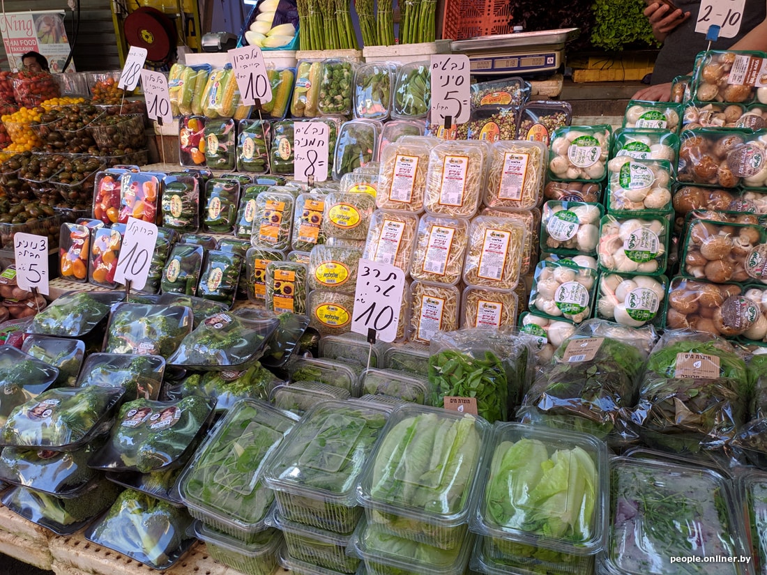 Ценник на продукты здесь поначалу впечатляет только отдельными пунктами: буханка хлеба обойдется в 15 шекелей (8,7 рубля), лоток клубники будет стоить 10 шекелей (около 6 рублей), кило огурцов — 5 шекелей (3 рубля), пачка макарон — 12 шекелей (7 рублей), рапсовое масло (подсолнечное здесь — редкость) — 18 шекелей (около 10 рублей), 200 граммов сыра — 16 шекелей (около 9 рублей), 5-процентная сметана — 6 шекелей (3,5 рубля).