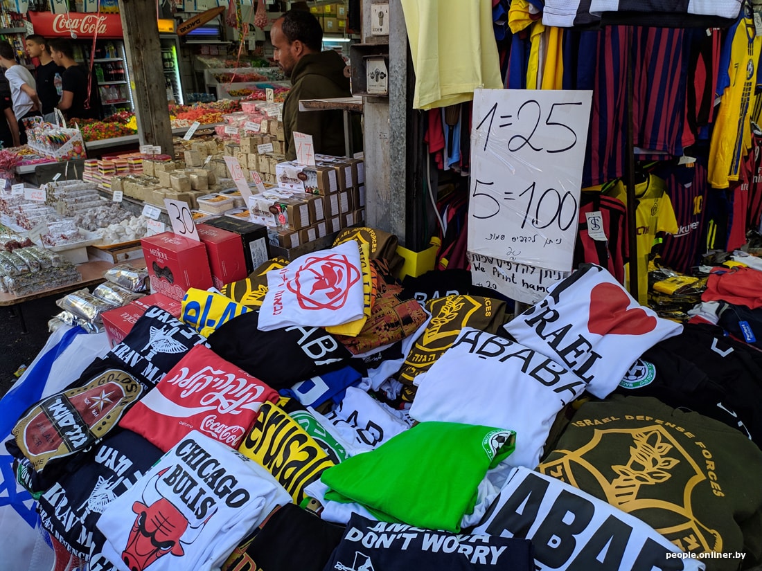 А теперь держитесь: мы переходим к самому вкусному. За колоритом, яркими красками, непередаваемым ароматом и аутентикой смело идите на городской рынок Кармель. Здесь можно найти все что угодно: свежайшие овощи и фрукты, безделушки и трикотажный ширпотреб, мясо и рыбу, специи и чай. Цены, в принципе, немного выше, чем в супермаркетах, но зато можно и нужно много торговаться. Если не сделаете этого, то можете купить две щедрые горсти вкусного чая за 300 шекелей (около 170 белорусских рублей). Продавец будет хлопать вам по плечу, улыбаться и говорить на ломаном русском: «Хороший компот!»