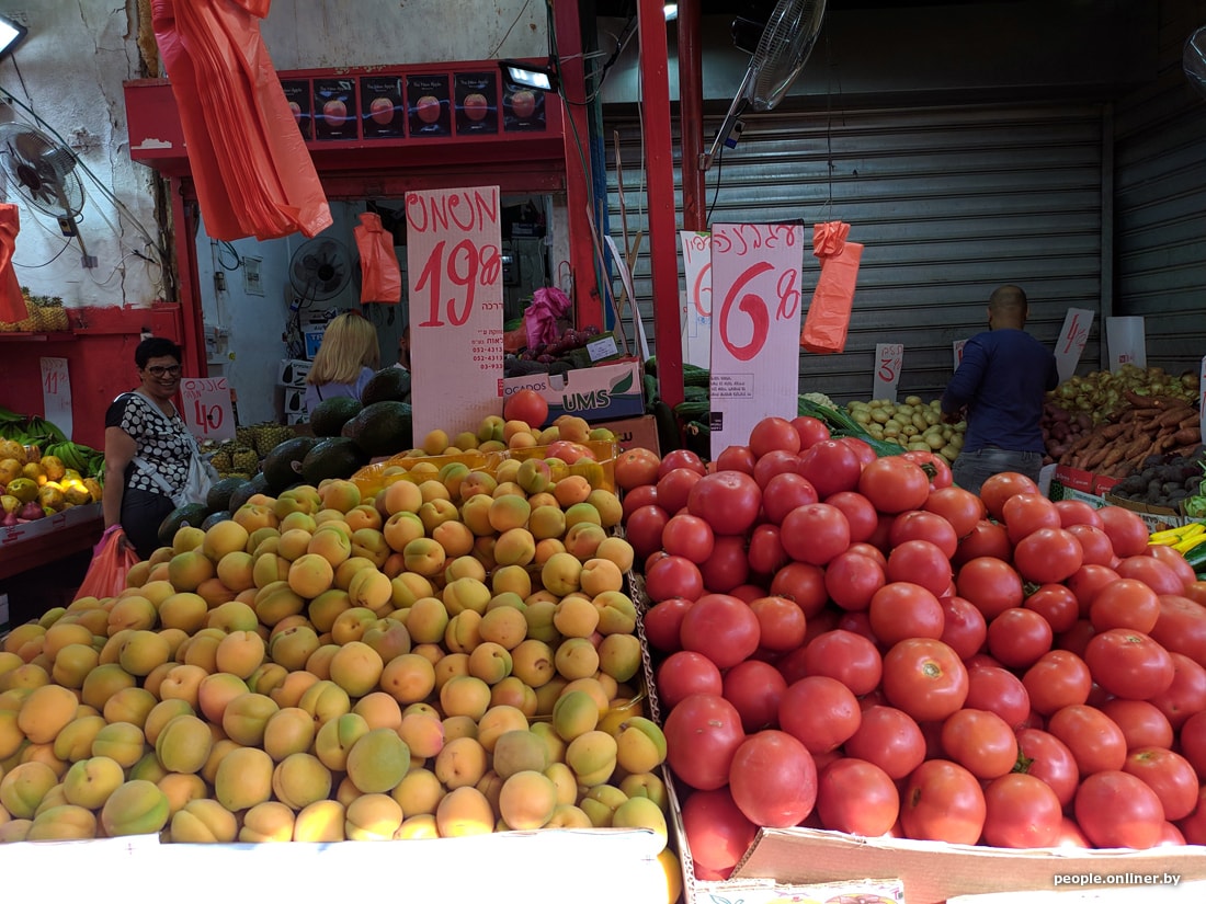 Ну а в целом здесь очень прилично: нет привычных для восточных базаров толп народа, продавцы не дергают за рукав в надежде продать свой товар, а сам товар по качеству очень хорош и вполне доступен. По крайней мере овощи и фрукты стоят чуть дороже, чем в Беларуси. Показываем цены: 1 шекель — это 0,58 белорусского рубля.