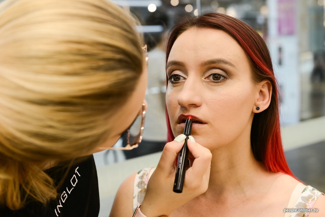 Макияж нанесли специалисты магазина Inglot. Цвет помады подобран под волосы девушки.