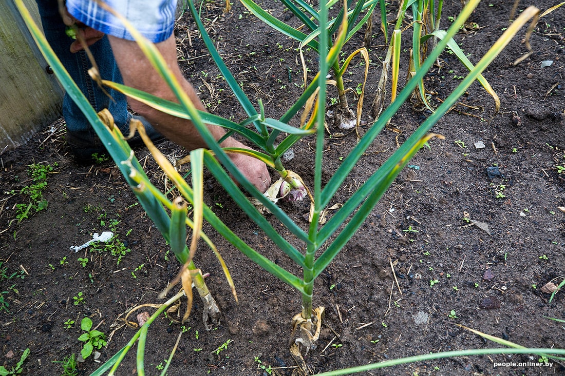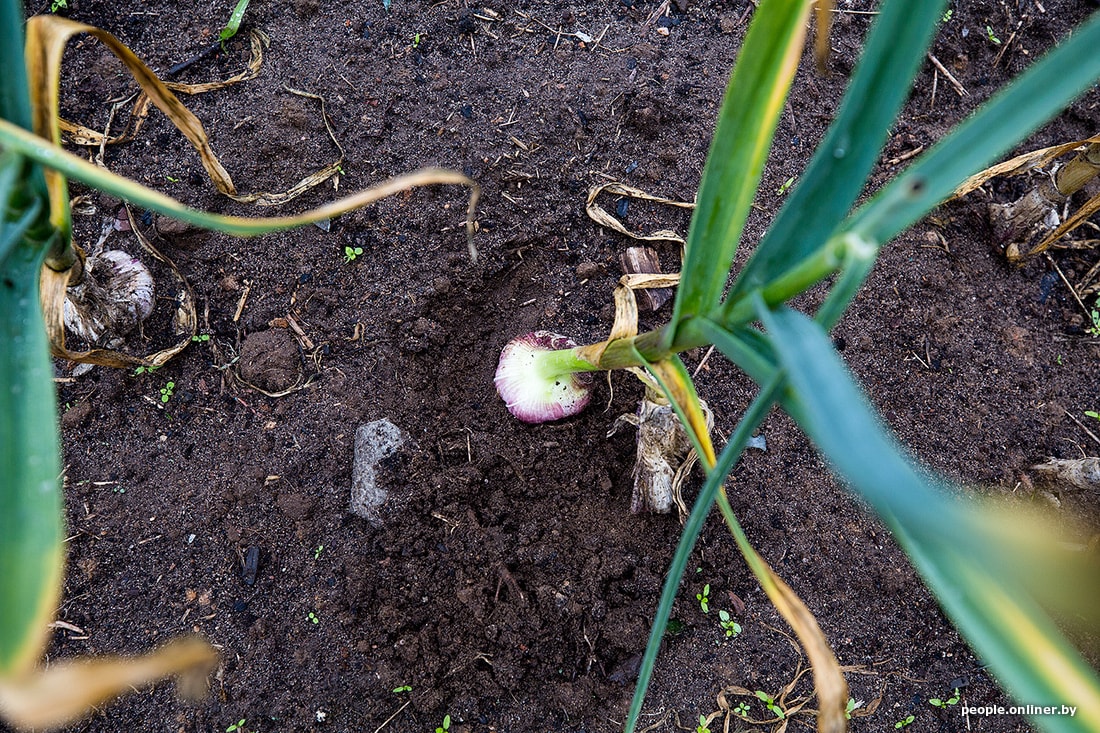 — А вот тут я экспериментирую с чесноком, выращиваю его на семена. Смотрите, какой большой, с кулак. Нет-нет, не китайский, белорусский, — фермер убирает немного земли и обнажает крупные головки чеснока. — Это сорт «Кличев-1», его вывел и запатентовал наш фермер Геннадий Варакса. Сейчас вот патентует яровой чеснок «Кличев-2».