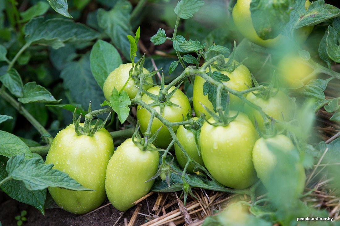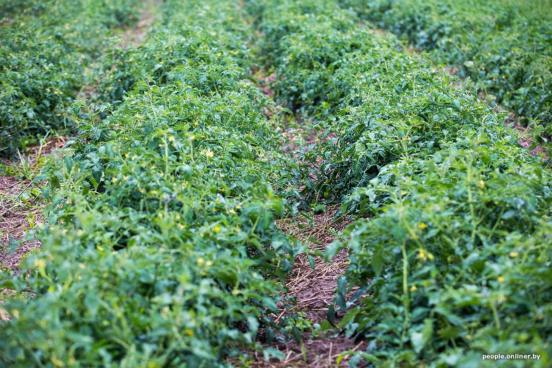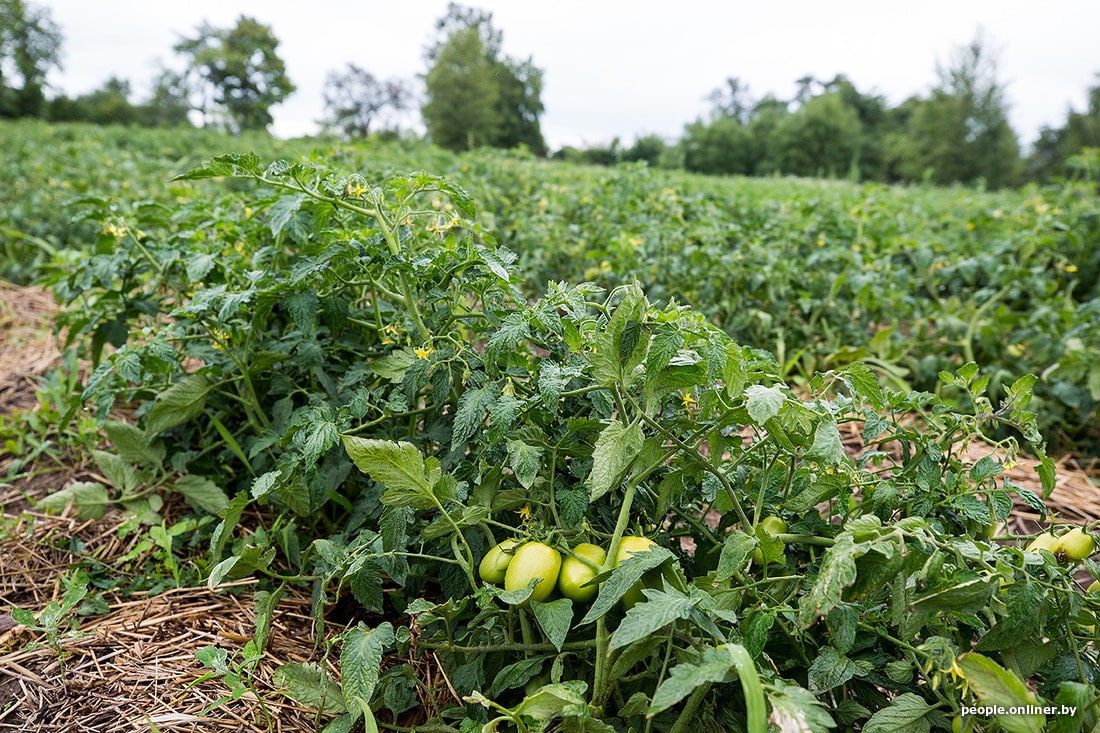 Дальше Виктор Петрович ведет на поле, которое вряд ли часто встретишь в Беларуси. Огромными раскидистыми кустами тут растут помидоры. Растения — без привычных палочек с подвязками, а сами плоды лежат на соломе.