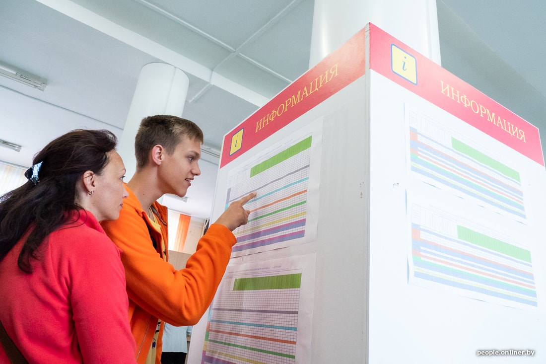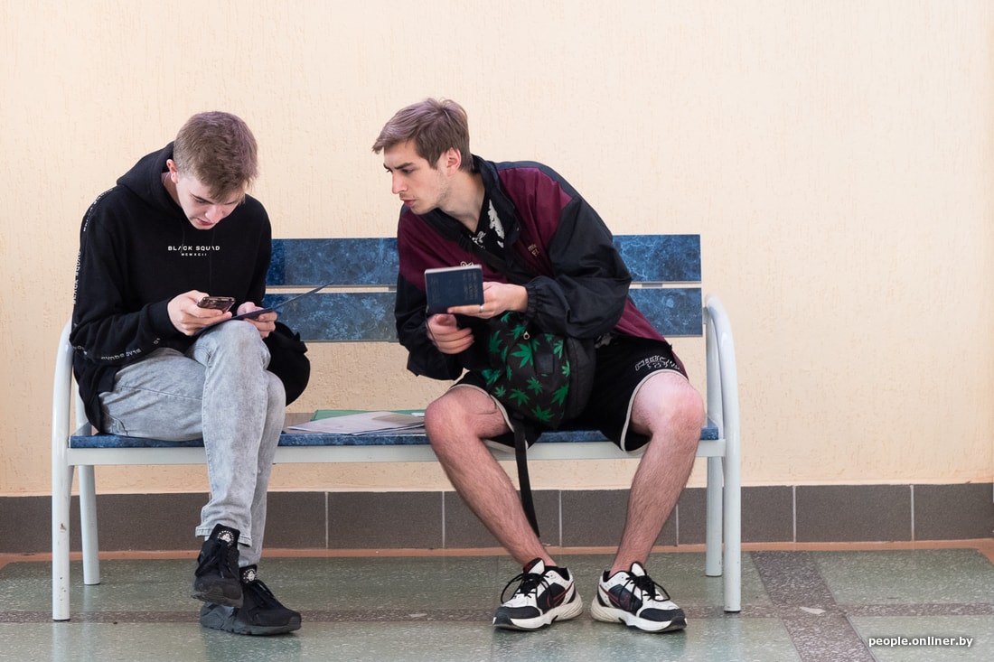 — Мы вообще не решили, куда будем поступать: не выбрали пока ни вуз, ни факультет, ни специальность. (Смеются. — Прим. Onliner). Смотрим варианты. Тут недалеко БНТУ — если что, сразу бежим туда, если в БГУИРе не получается, не хватит баллов. Для того и есть мониторинг. Сейчас подавать документы не будем, посидим до шести. Такой план. Баллы у нас низкие — 183 и 211. Хотим на бюджет. Мы после колледжа, на платное нам нельзя, иначе придется заплатить за колледж. Да, онлайн-мониторинг последний раз обновится в 15:00, но они, наверное, вручную что-то обновляют, подходят, стирают, записывают карандашом — как в БНТУ делают. Поэтому есть смысл сидеть до шести, если ты не знаешь [куда поступить].