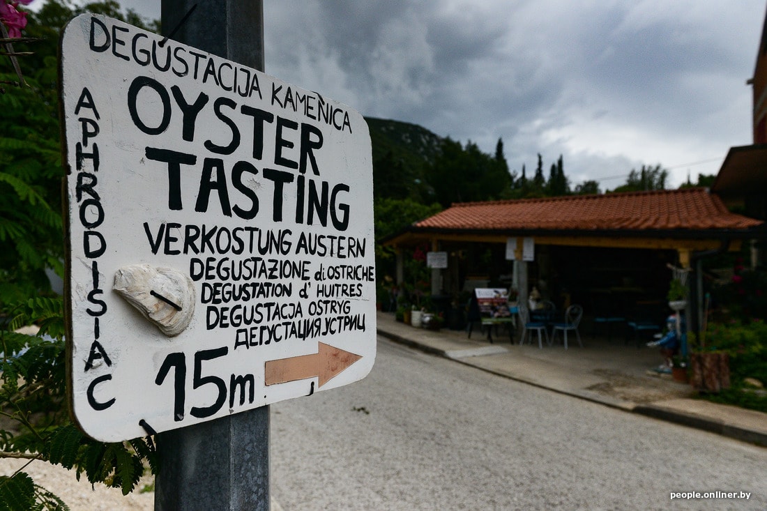 4. Во-вторых, считается, что в Малом Стоне самые вкусные устрицы в Хорватии, Европе и мире (хорваты славятся своей скромностью). Вокруг множество устричных ферм. Рядом с парковкой у крепости парень предлагает устроить дегустацию. Одна устрица — €1. Это прайс для самых мелких экземпляров. Парень — бог маркетинга. «Пусть твоя дама улыбается чаще сегодня», — призывает в гости рекламная надпись на картонке.