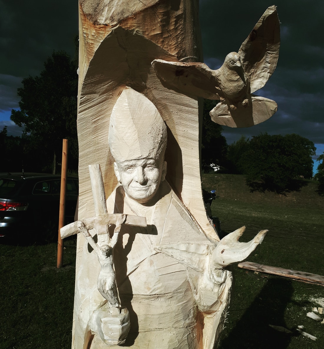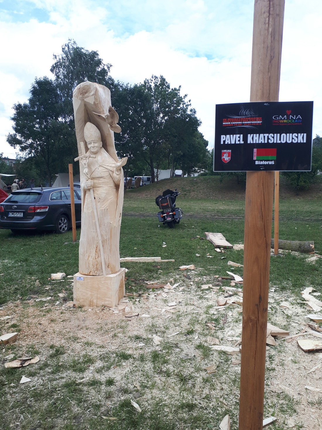 А это чемпионат в Польше — за три дня сделал папу римского. Поехал туда на мотике, загрузил две пилы в задний чемодан — и вперед. Меня периодически останавливают на таможне: «А чего так много пил?» Я им отвечаю: «Это потому, что я белорус, так бы было еще больше». Немцы с собой 9—12 возят, а я беру самое необходимое.