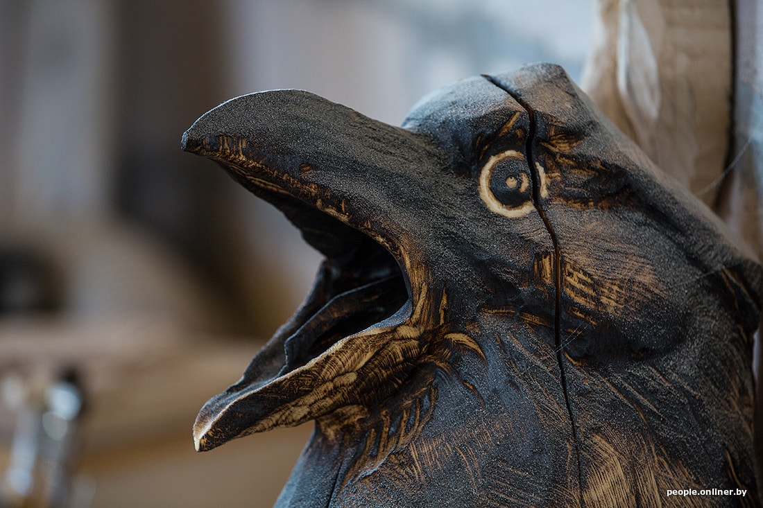 — Еще в театре мы работали пилами, если были объекты покрупнее. Я попробовал электропилу и понял: «Блин, а это прикольно!» Потом взял вторую, третью… Сейчас у меня спрашивают: «Зачем тебе столько?» Но это не фетишизм или коллекционирование. Да, они красивые и технологичные, но у каждой, кроме этого, еще и свой функционал. Вот этой я отламываю большие ломти от бревна, вот эта уже чуть покороче, но она с острым носиком — ей можно делать усредненную деталировку. А вот этой я вообще портрет могу сделать: все вот это, кроме глазок и носика, сделано пилой, — это Паша берет в руки свою «бэйби». — Вот эта штука совсем легонькая. Видишь? А теперь возьми и попробуй вот эту — и это она еще без топлива! Когда ее заводишь на каком-нибудь фестивале, народ сбегается с открытыми ртами. Шоу!