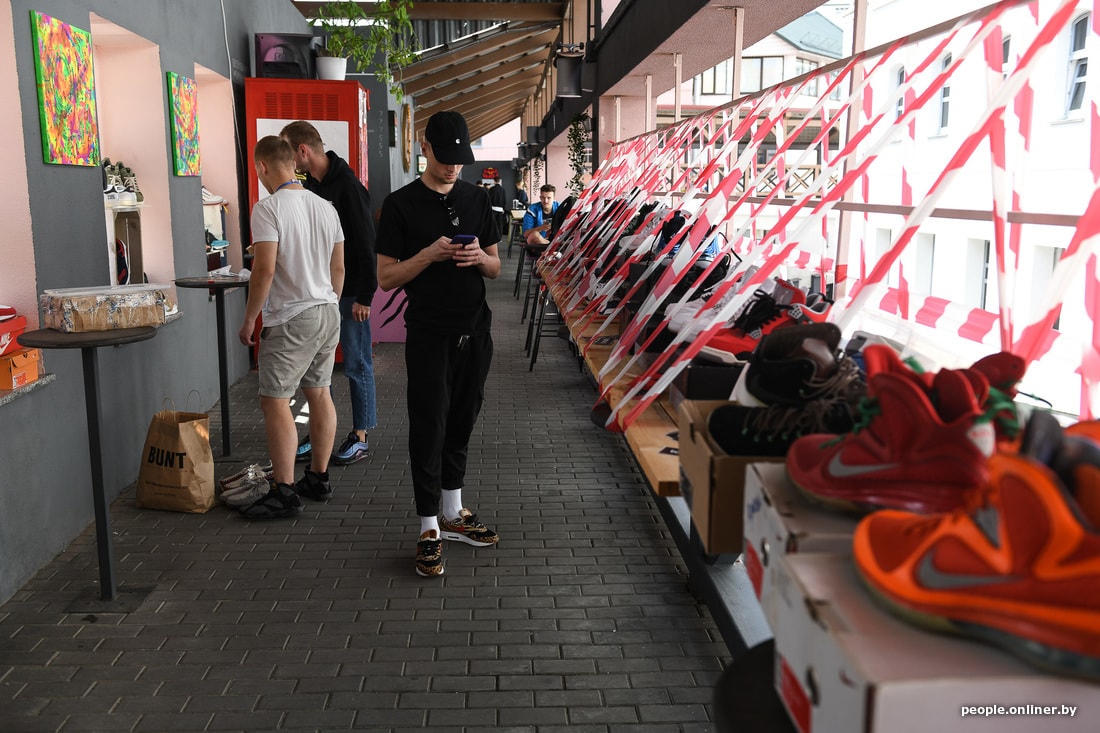 — Ребята из The Wall придумали устроить гаражную распродажу и предложили помочь в проведении этой штуки, — рассказывает столичный любитель кроссовок Денис Самсонов, передвигаясь по пространству в своих черных «адиках». — Тусовка новая, такого в Минске никто и никогда не проводил. Здесь продают ходовые модели кроссовок и показывают редкие. Наши коллекционеры поделились своими парами. Они стоят в окнах. У кого на что денег хватило, местами очень нескромные вещи.