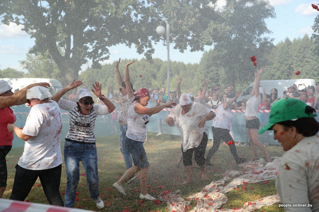 На арену вышли две команды по десять женщин, которые в три захода превратили площадку в томатное месиво. После жарких состязаний женщин неожиданно полил водяной фонтан из пожарной машины. Где вы еще такое увидите?