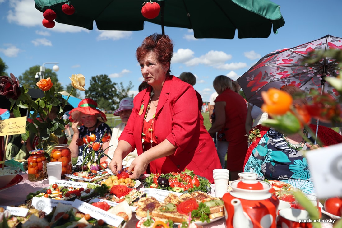 Многие горожане пришли поддержать местный бренд в красной одежде. Они поют песни, танцуют и едят все, в составе чего есть помидор.