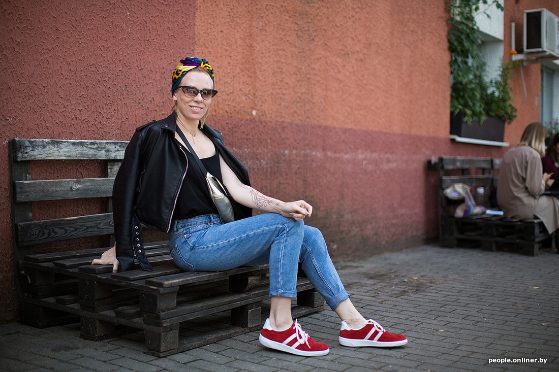 — Это лидские кеды, они стоили 25 рублей со скидкой в ЦУМе. Я прямо тащусь от них. Джинсы стоили рублей 50, куртка — рублей 80. Сумка от белорусского дизайнера Hollywool — долларов 100. Майка — 25 рублей. Очки — 30, брала в каком-то магазине очков. Платочек подарили. В месяц на одежду трачу не много, раньше было больше. Сейчас посмотрю в программе: в июне потратила 300 рублей, в июле — 12, в августе — 80. Когда часто переезжаешь, одежда обычно выбрасывается.