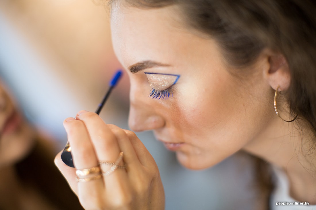 Для первого макияжа необходимо всего ничего: синяя подводка, шиммер или тени с блестками, синяя тушь и блеск для губ с блестками. Предварительно, конечно, обязательно нужно выровнять тон лица с помощью тонального средства, минимально скульптурировать лицо и подсветить хайлайтером. Пошагово эти действия не раз расписывались в прошлых статьях рубрики. Кстати, к осени в косметических магазинах Минска заметно прибавилось тюбиков с цветными подводками и тушью, что также отражает разноцветные тенденции.