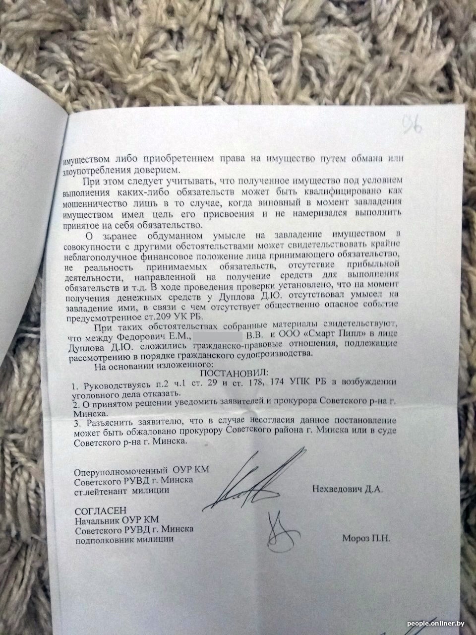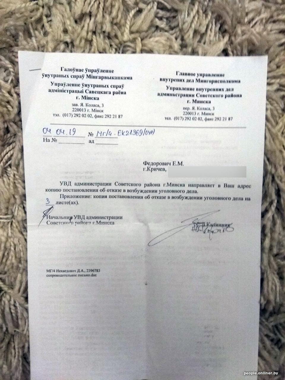 Елена вместе с еще одними пострадавшими написала заявление в Кричевский РОВД. Его перенаправили в Советское РУВД Минска, а уже оттуда пришел ответ, что нет состава уголовного преступления. Женщине посоветовали идти в суд.