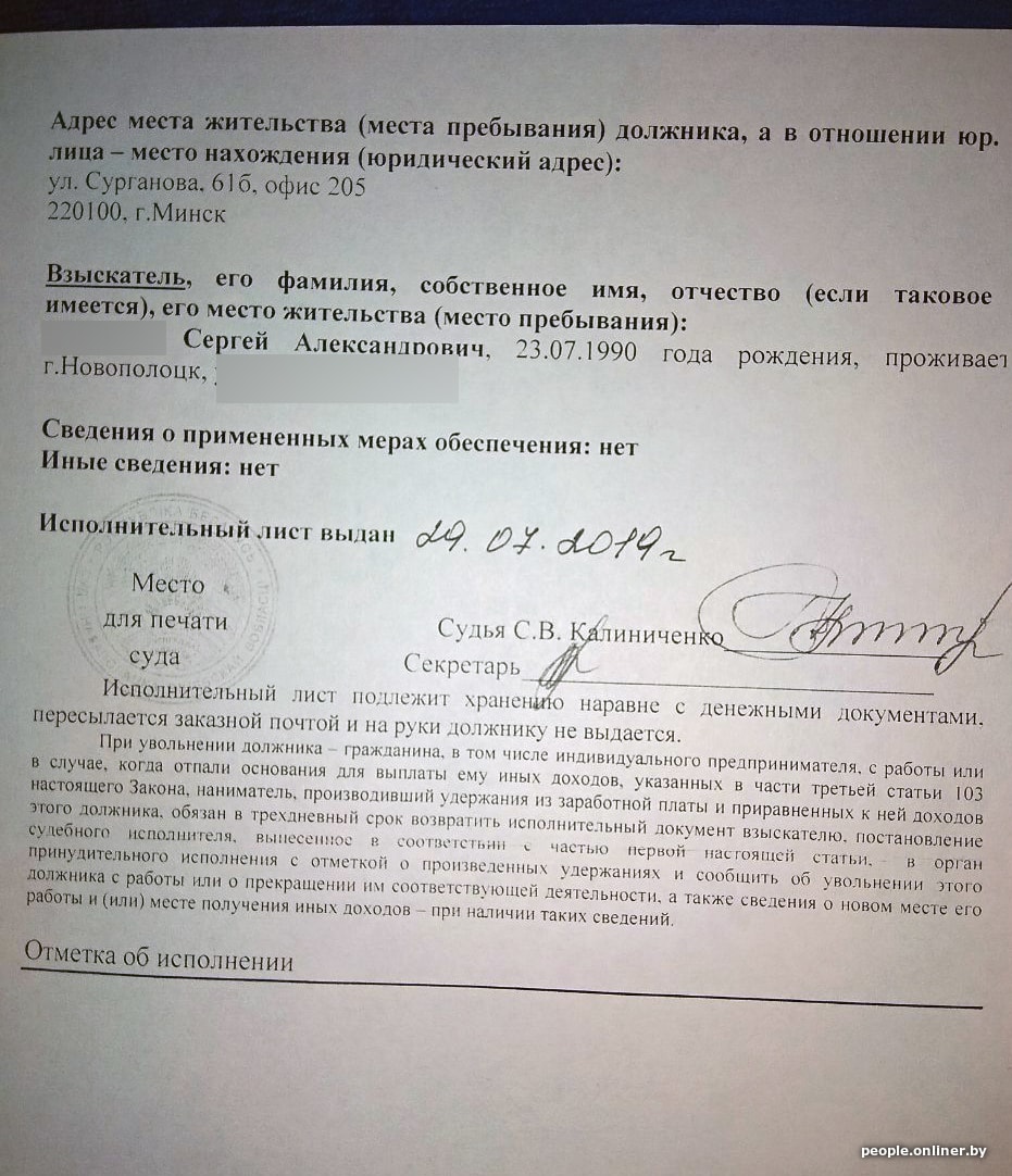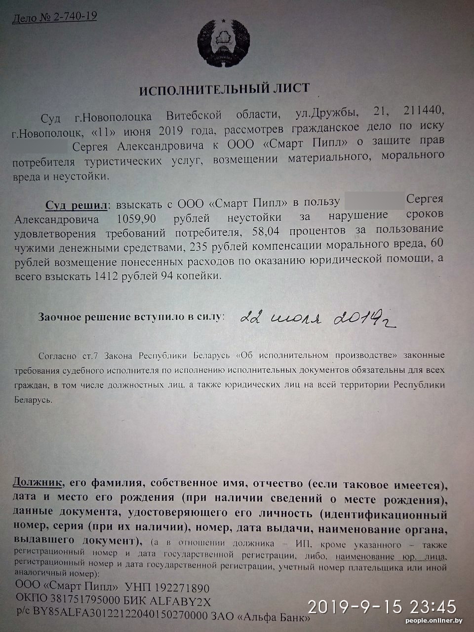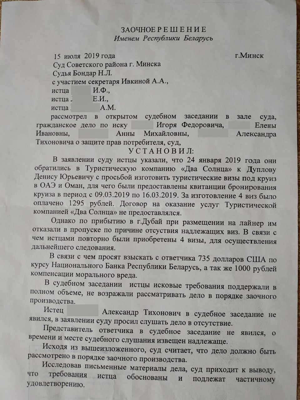 — Когда мы приехали домой, то потребовали вернуть нам деньги. Он все обещал, но не вернул, — рассказывает Игорь Федорович. — Тогда мы пошли в суд. На суд директор Денис тоже не явился. Заседание провели без него. Суд принял решение, по которому директор должен выплатить нам $735 по курсу Нацбанка, а также 1000 рублей компенсации морального вреда. Денег мы не получили до сих пор.