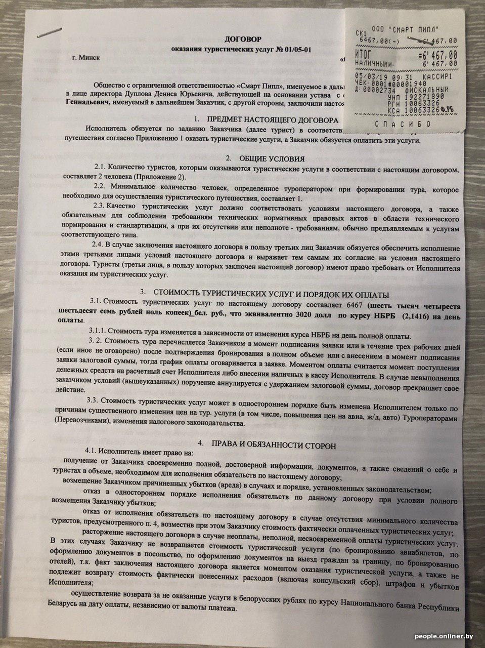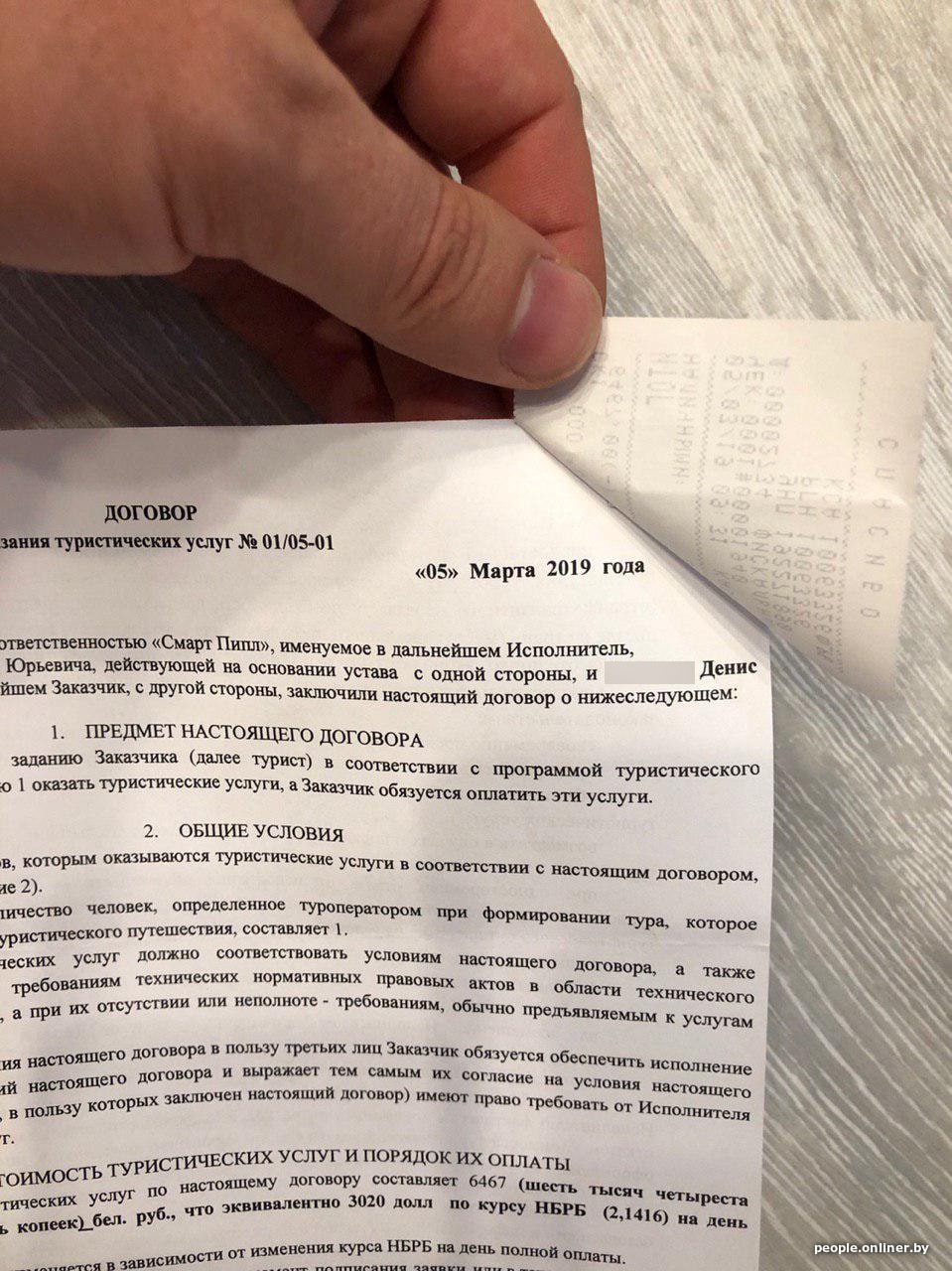 — Мы подписали договор и выплатили €1000. За месяц до поездки я должна была оплатить оставшуюся сумму, — говорит Снежана. — Когда пришла в офис во второй раз, директора на месте не было. Девушка приняла деньги, написала дату и сумму в €1273 на договоре и поставила печать.