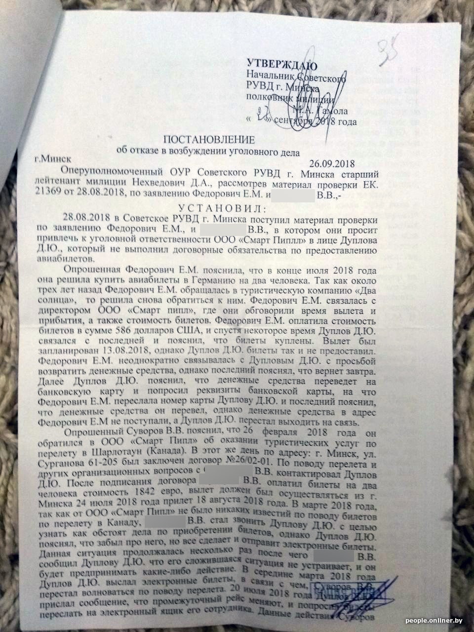Игорь, Денис, Елена, Снежана и Сергей говорят, что в их группе пострадавших уже больше 30 человек. Все они бывшие клиенты минской турфирмы «Два солнца», которая принадлежит ООО «Смарт Пипл», и столкнулись с проблемами. У кого-то отменился тур и им не вернули деньги, у кого-то были вопросы с визами, с билетами. Директор турфирмы Денис Дуплов говорит, что деньги всем вернул, кроме одной семьи, остались только иски по моральной компенсации, а также заявляет, что компания вскоре будет закрыта.