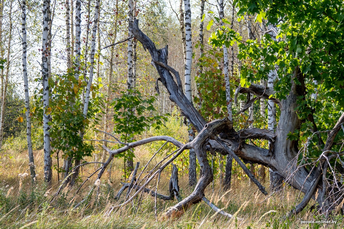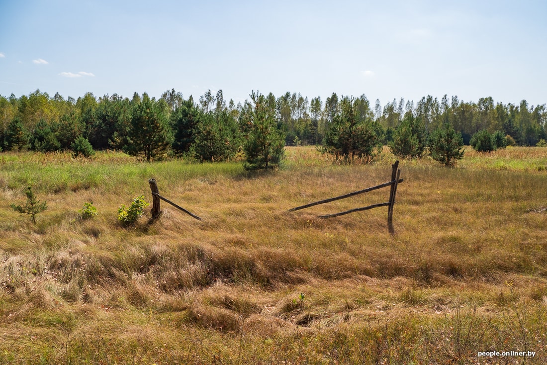 Эта территория внутри Добрушского района уникальна. Во-первых, она принадлежит России. Во-вторых, по ней прошлись многие знаковые события XX века: раскулачивание, репрессии, Вторая мировая, во время которой фашисты сожгли почти все дома. В 1986-м ляснул и Чернобыль — через пять лет из зоны отселения Медвежье-Саньково выехал последний житель. Теперь внутри «белорусской России» — заросли, кладбище, заброшенная остановка и несколько фундаментов — лишь пригоршня намеков на то, что когда-то здесь была жизнь.