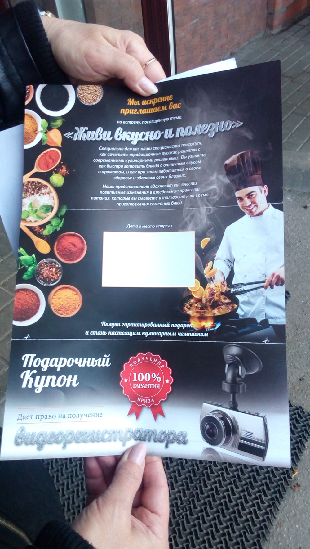 На наших глазах продавцы посуды и одеял выходят на новый уровень. Не от хорошей жизни. Потенциальные покупатели пресытились обычными зазывами «приходите, поедите». Приходится суетиться чуть активнее. Наш читатель рассказал о свежем примере от компании Invitan: вместо презентации посуды приглашают в кулинарную школу и дарят видеорегистратор!