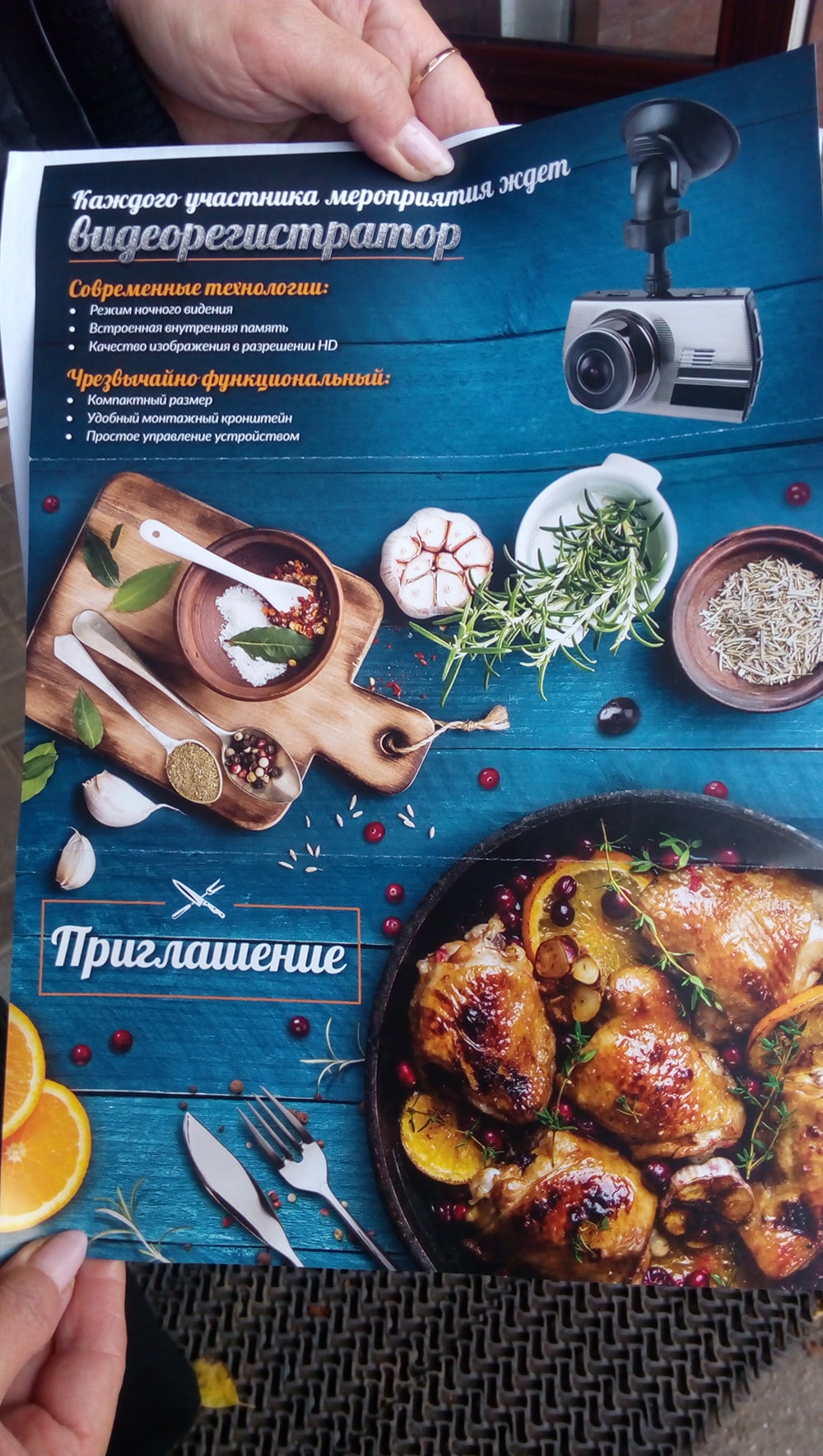 Как итог: мы пошли на курсы для набора учащихся в новую кулинарную школу, где в качестве фуршета отведали кусочек курочки и пирога на зубочистках, унесли с собой три видеорегистратора (которые оказались потрепанными, с царапинами и дефектами, один из которых не запустился, да и вообще очень сомнительного качества), потратили в районе трех часов, но насмеялись, посмотрели на весь этот развод изнутри, как я и хотел.