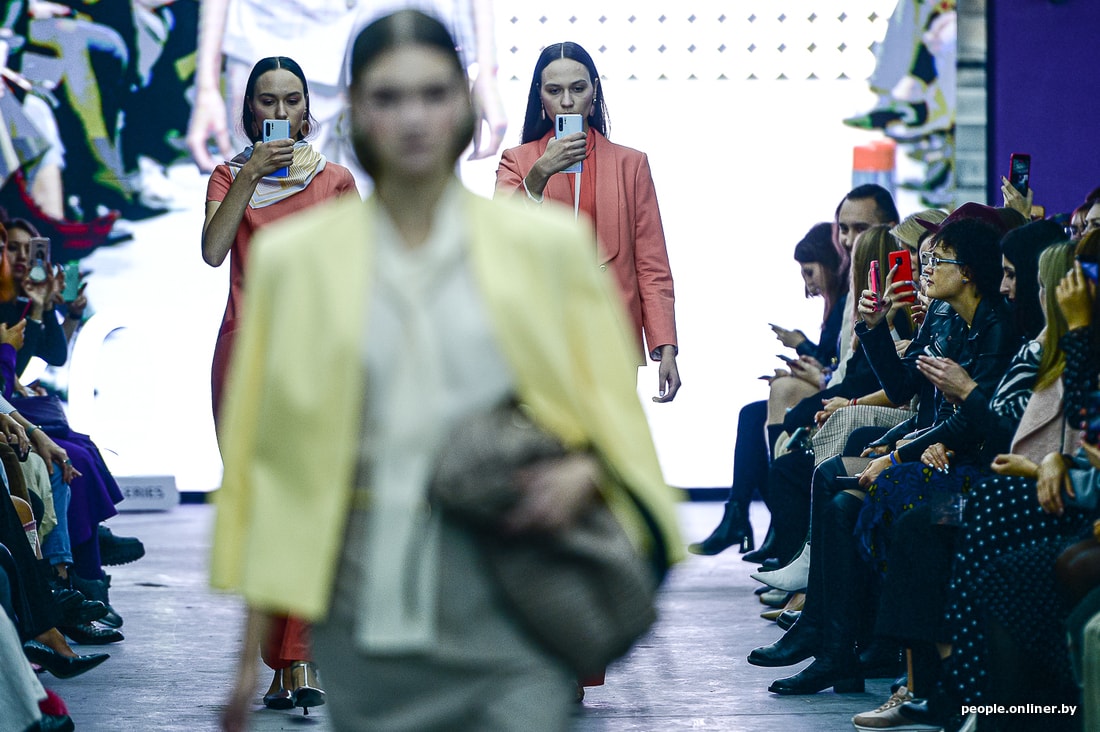 Интересное решение на показе Nelva: дефиле крупным планом транслировалось на экран, а некоторые модели снимали себя в режиме онлайн.
