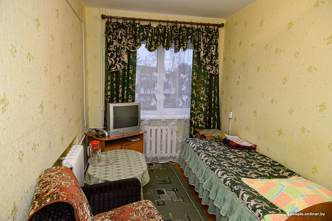 После этого диалога мы уже начинаем сомневаться в туристическом потенциале района и спешим в гостиницу развеять скепсис. Спешить близко: гостиница «Россоны» расположена прямо в центре поселка. Это идеальная локация для старта пешей прогулки и тщательного осмотра достопримечательностей. Сотрудники гостиницы вряд ли изучали отзывы в Google, но если бы изучили, то наверняка бы расстроились. Пишут про «советский ремонт», «Wi-Fi через SMS-сообщение», старую сантехнику и дверь в санузел, которую невозможно открыть до конца, потому что мешает унитаз. Мы смотрим самый дешевый номер за $13 за ночь — вот так это выглядит.