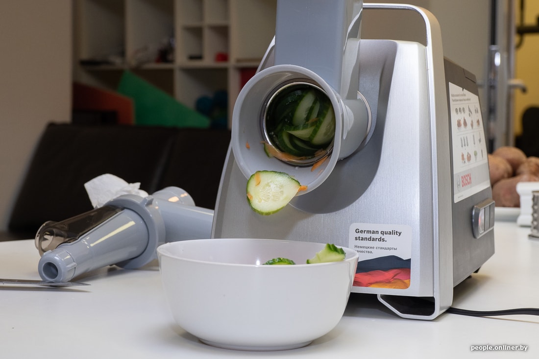 Картофель для драников, в принципе, тоже получается неплохо, главное, не пытаться запихивать большие куски картофеля (замыливается и почему-то выступает много воды). Нужно было перетереть большое количество моркови — слишком долго трет и постоянно забивается».