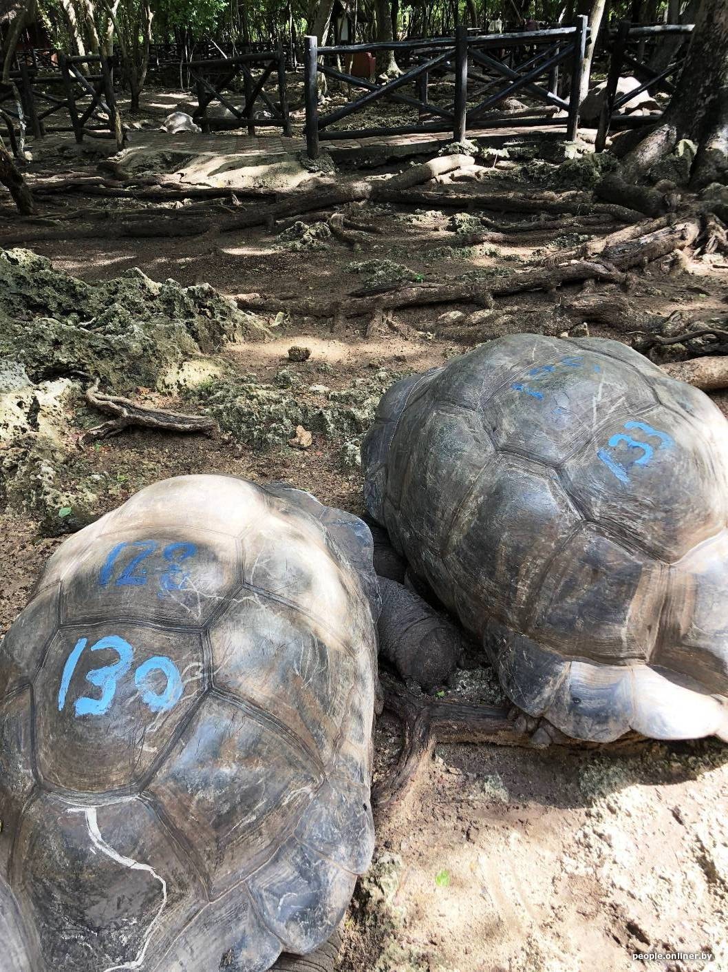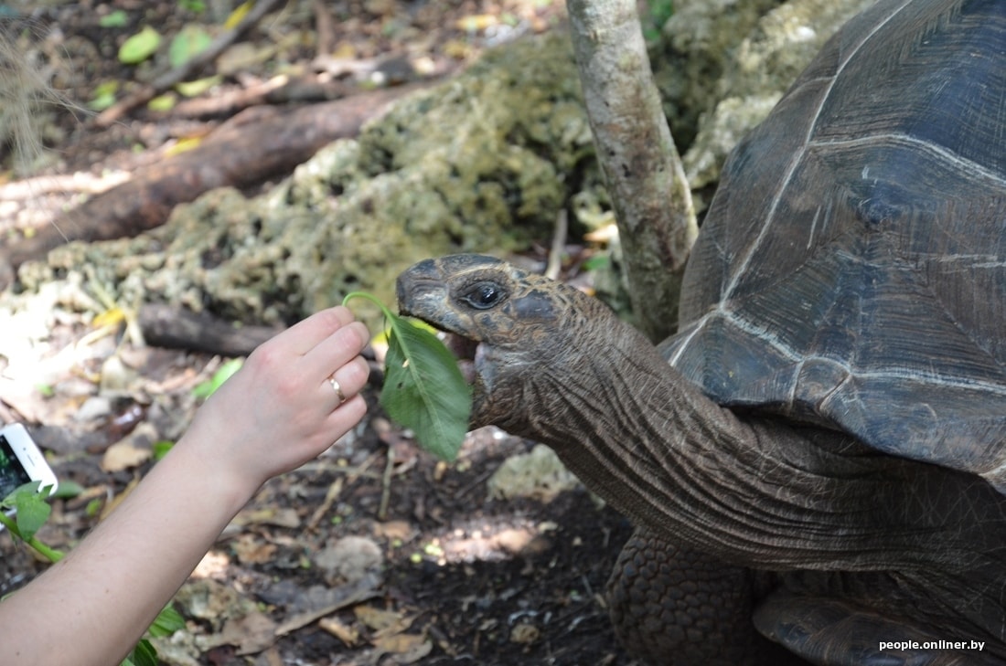 На следующий день у нас была поездка на остров Prison Island, или Тюремный остров. Там находится ферма, где выращивают больших сейшельских черепах. На панцирях написан их возраст. Самой взрослой, которую мы видели, было 196 лет. На входе дают веточку водорослей, которыми можно кормить черепах. Для них это лакомство, и они с удовольствием едят с рук, главное, беречь пальцы. Приходить лучше пораньше утром, пока туристов немного и черепахи еще не перекормлены. Поездка на остров на лодке и входные билеты обошлись в $18 за двоих.