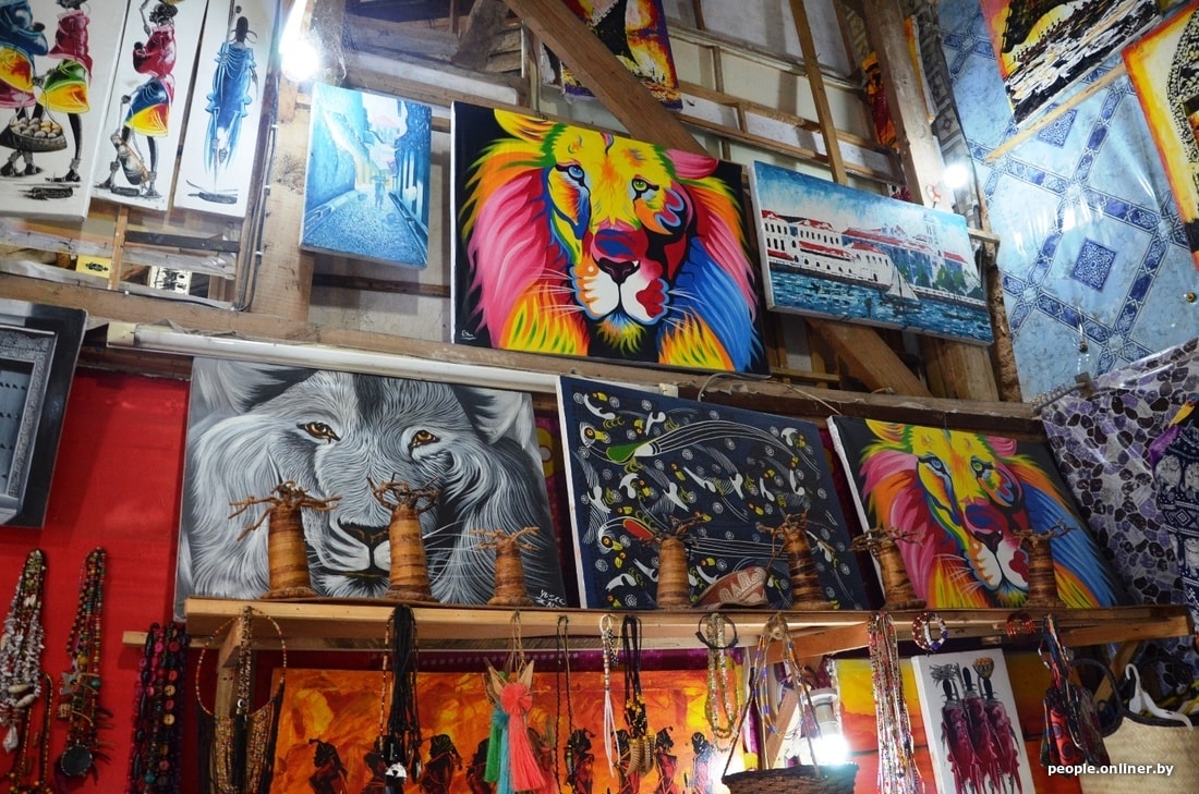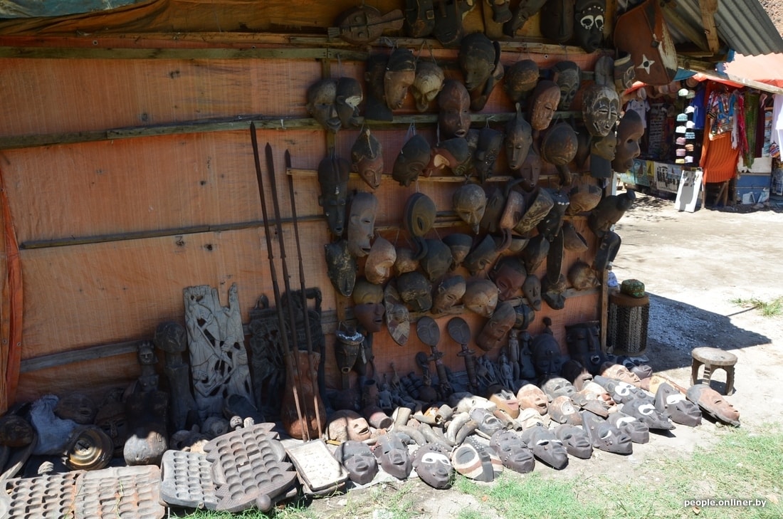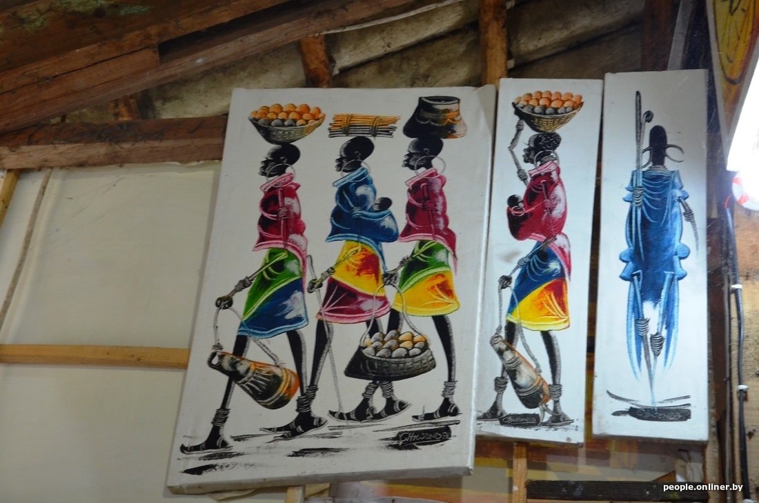 Последний день путешествия мы потратили на покупку сувениров и фруктов. Здесь очень большой выбор сувениров именно местного производства: статуэтки из дерева, маски и многое другое. Картины в стиле народной живописи тингатинга, где основные сюжеты — животные или масаи.