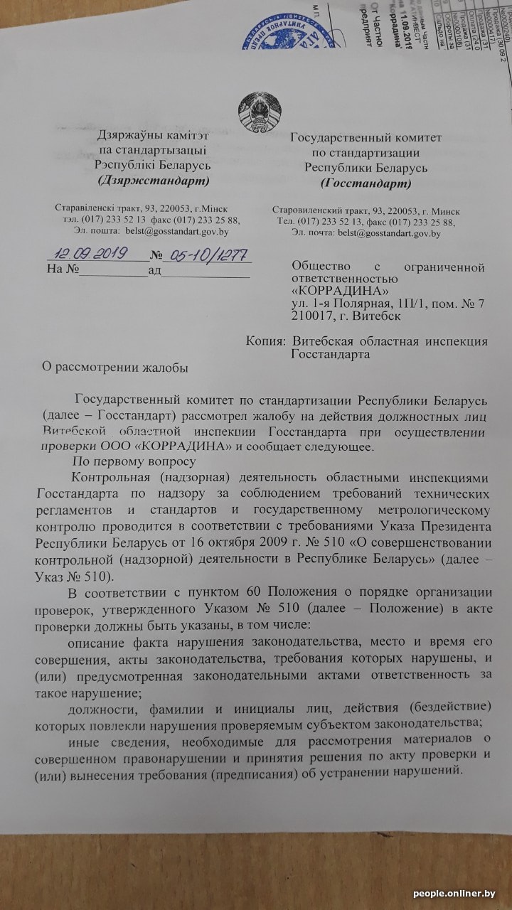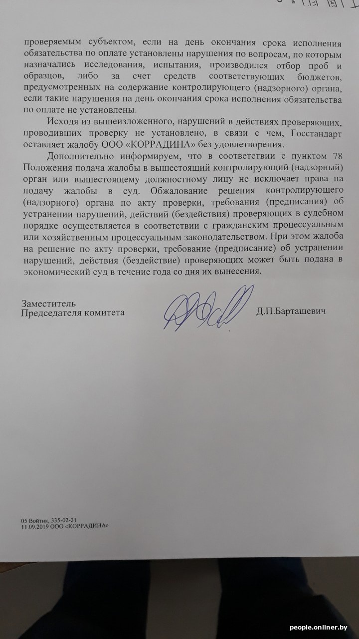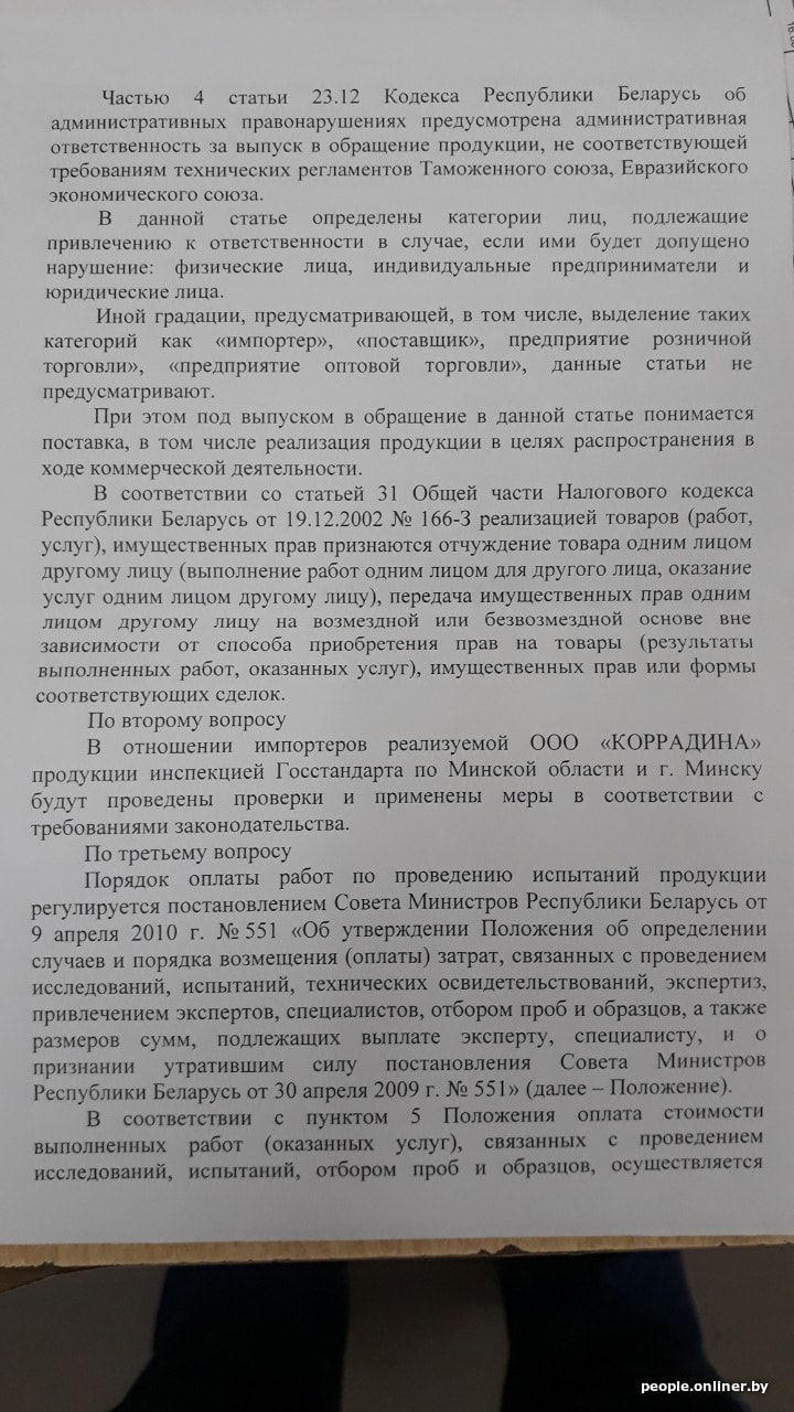 В рамках политики обеспечения безопасности населения Госстандарт ведет проверки по большим и малым бизнесам страны. Одним из объектов этой проверки стало витебское ООО «Коррадина». Инспекторы составили акт о несоответствии и прописали бизнесмену платежку за проведение испытаний и, собственно, штраф. Предприниматель стал бодаться.