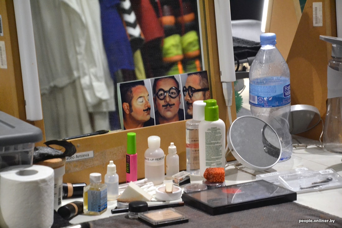Идем в гримерку: большие столы, зеркала с подсветкой, много кистей и грима. Любопытно, что профессиональных гримеров у артистов нет: перед каждым выступлением грим они накладывают сами.