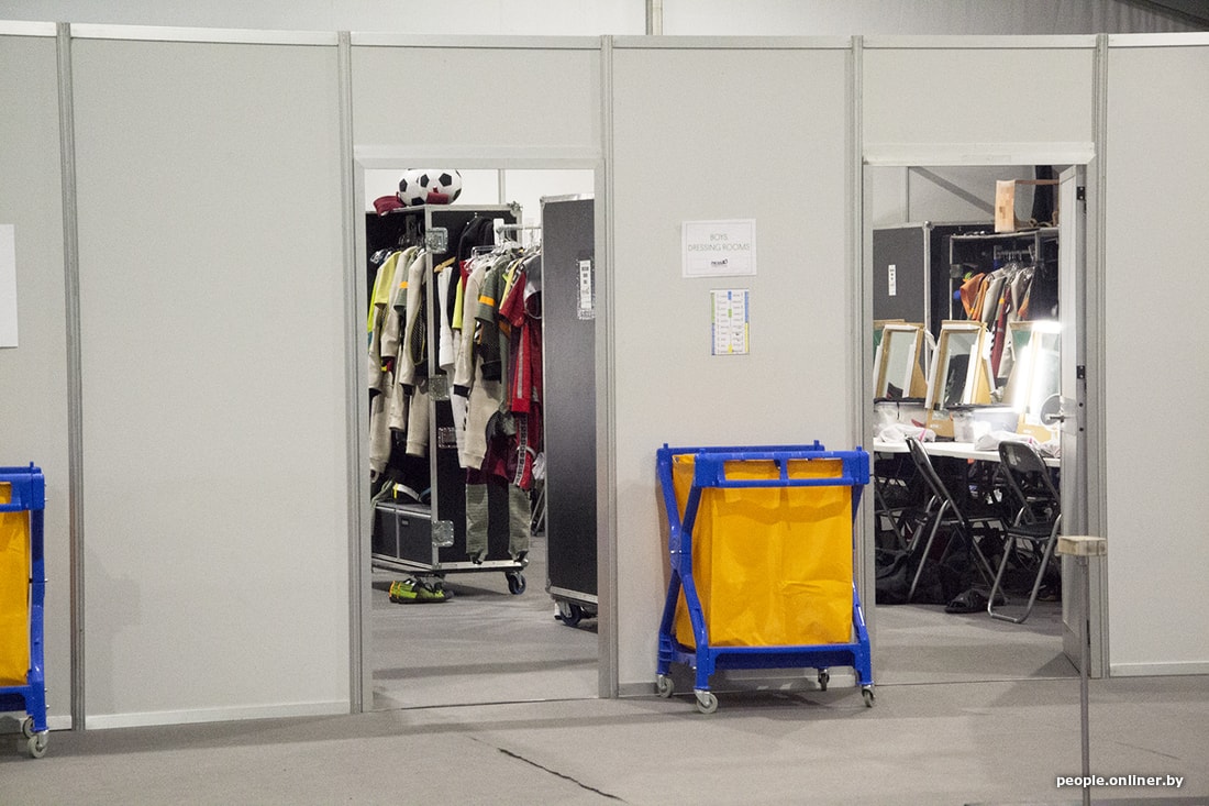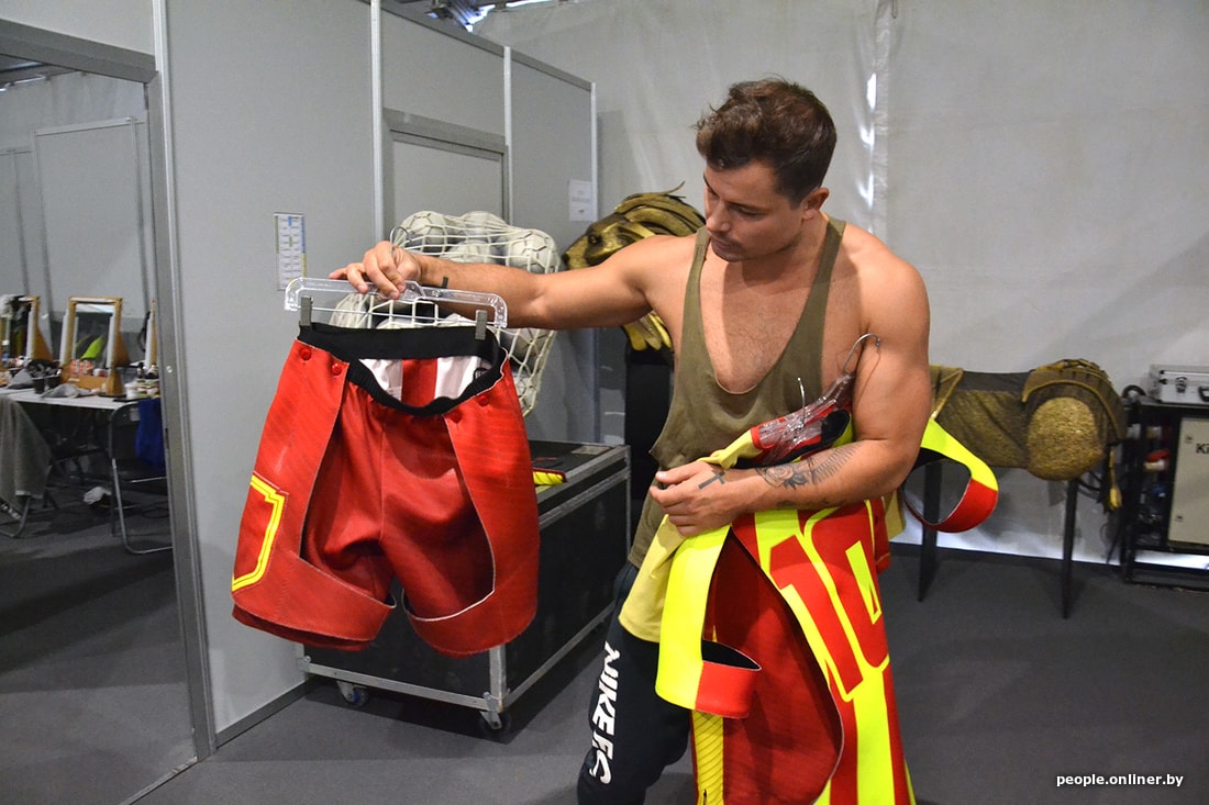 Мы попадаем в костюмерную. Фотографировать тут не разрешают. Игорь выносит свой костюм — бутафорскую яркую футбольную форму с номером 10 и фамилией Месси на спине. В этой форме он вместе с 11 атлетами участвует в общем номере.