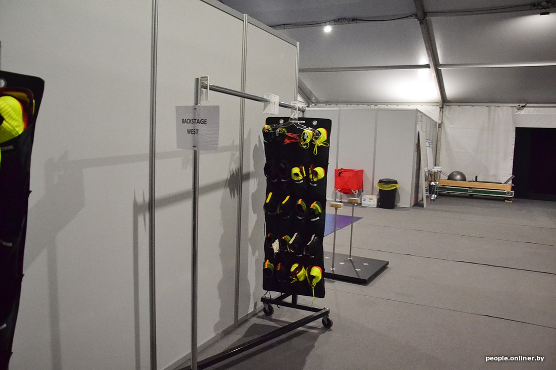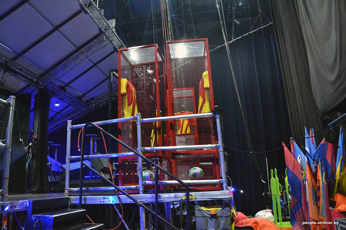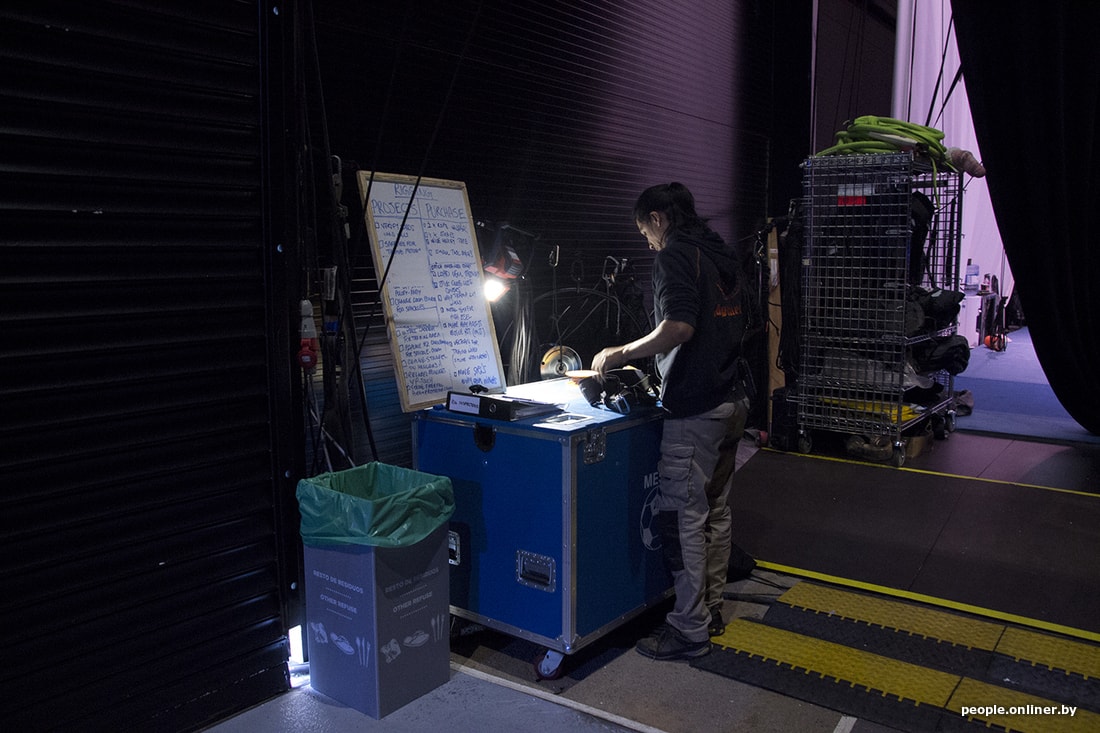 Игорь показывает закулисье. До начала 29-го шоу Messi10 еще часа четыре. Зрительный зал пока пуст: технические работники завершают последние приготовления, проверяют свет и звук. На шоу у них должна быть идеальная слаженность с акробатами. Техники готовят инвентарь: батуты, канаты, специального робота — и все остальное.
