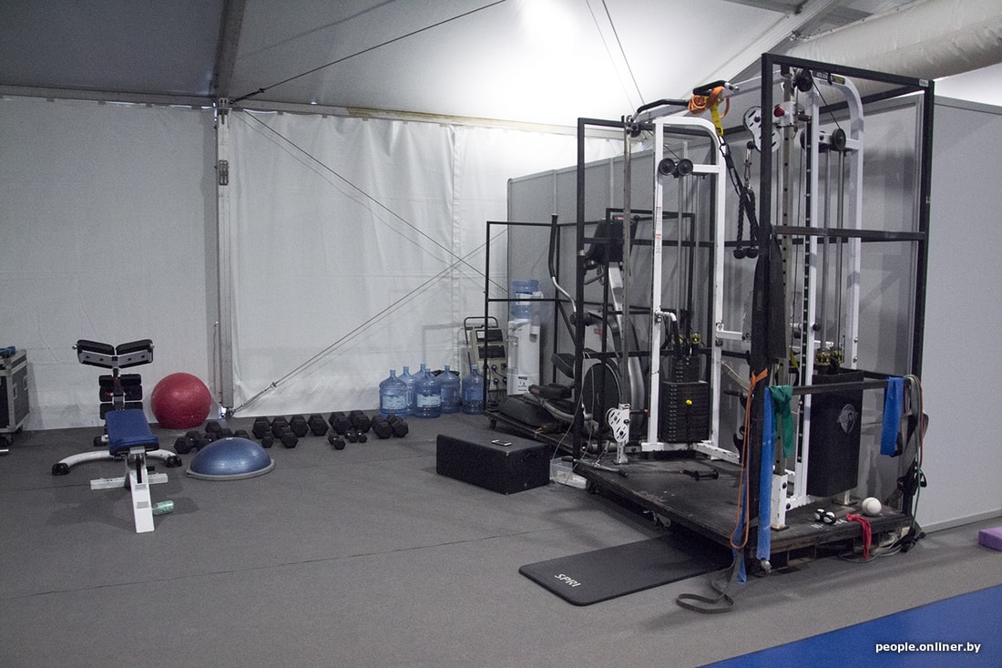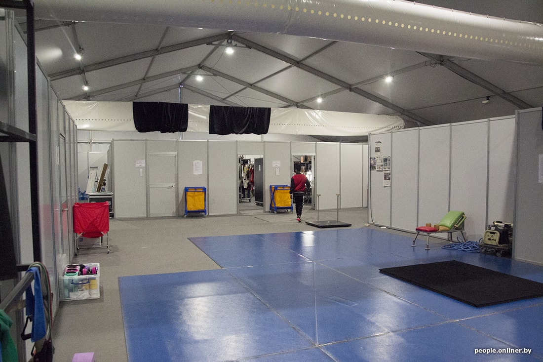 На полу комнаты лежит мягкое покрытие, стоят тренажеры, а в отдельном уголке есть телевизор и диванчики, где акробаты пересматривают свои выступления и анализируют их.
