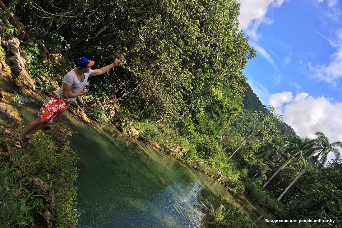 Здесь же мы решили самостоятельно организовать экскурсию по пещерам. Пещера Сатурна с целебным воздухом и кристально чистой водой впервые была обнаружена беженцами, а затем стала лазаретом для пострадавших во время войны. Дайверы приезжают сюда для того, чтобы погрузиться в озеро с целительной водой. Его глубина — более 20 метров. Здесь водятся удивительные рыбы, а само озеро имеет ряд подводных пещер, но без акваланга туда не добраться. Вход в пещеру стоит $5.
