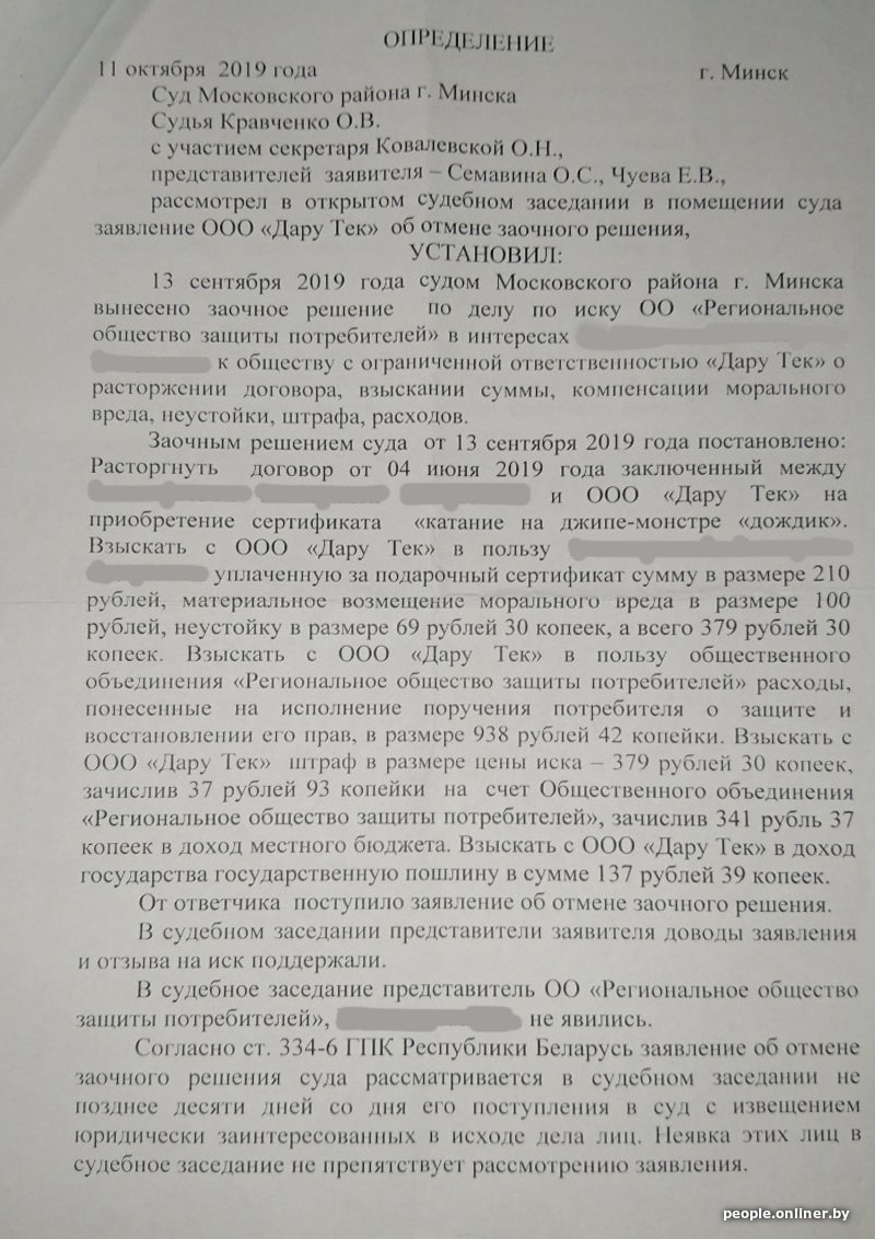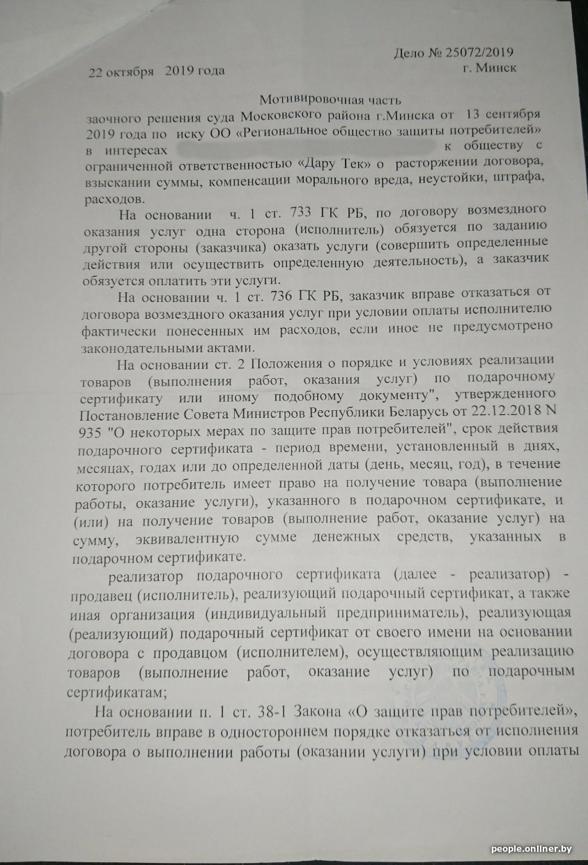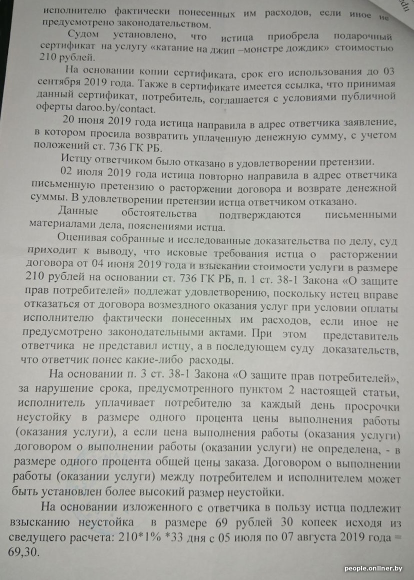 В июне Екатерина купила у Daroo подарочный сертификат за 210 рублей, по семейным обстоятельствам стало не до развлечений — решила вернуть и забрать деньги. Но руководство этой организации установило срок возврата в течение 14 дней со дня покупки. Оказалось, это ограничение незаконно. В итоге минчанка выиграла два суда и считает, что компания вводит в заблуждение своих клиентов.