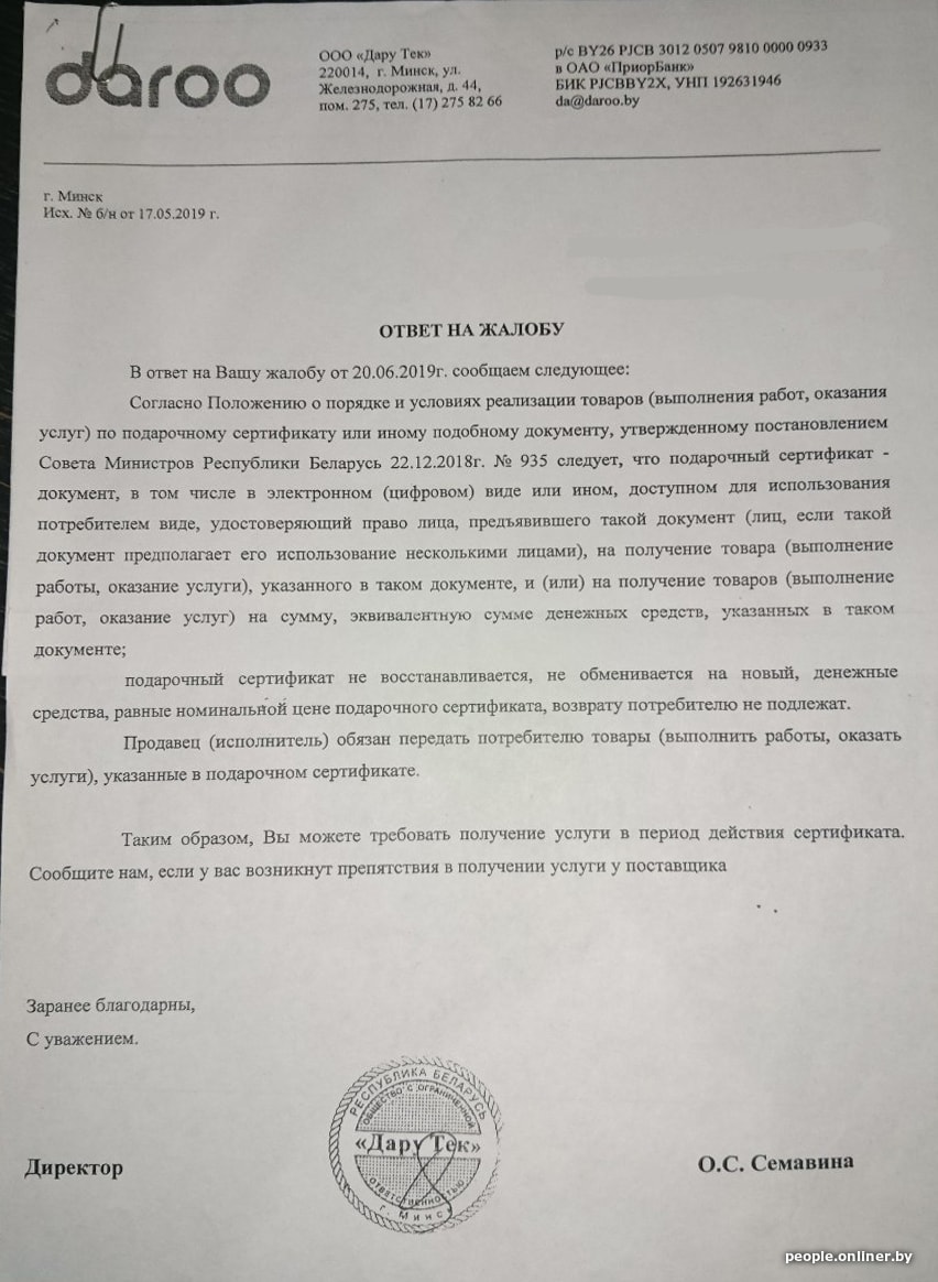После того как девушке отказали в возврате сертификата, она оставила запись в книге замечаний и предложений. Получила ответ, в котором, ссылаясь на постановление Совмина №935, Daroo сообщает, что сертификат не подлежит возврату и обмену.