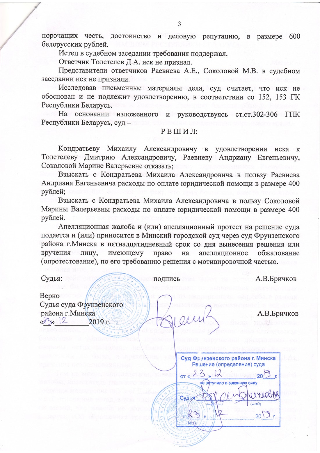 ...Адвокаты Раевнева и Соколовой затребовали компенсацию юридических убытков, и каждый насчитал по 400 рублей. Я их требования отказался признать. На вопрос судьи, по каким же причинам, ответил: „По морально-этическим. Эти люди нанесли мне вред, они должны платить своим адвокатам сами!“
