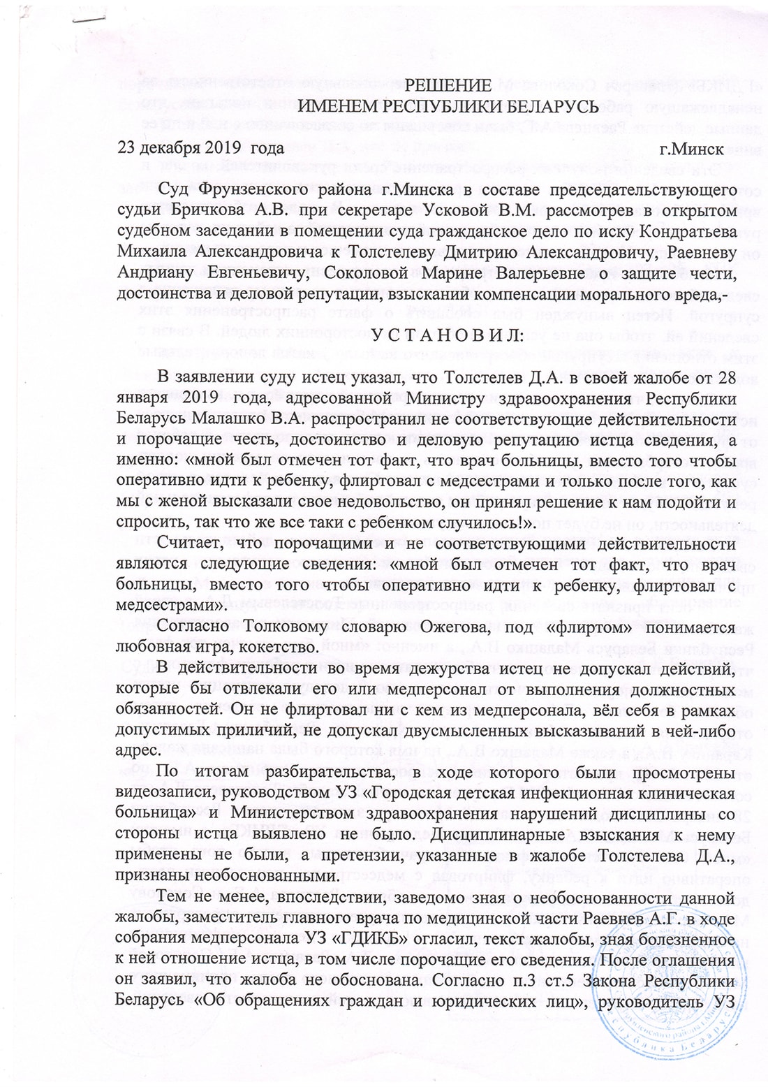 Суд Фрунзенского района Минска вынес решение по иску Михаила Кондратьева. Педиатр просил защиты чести и репутации, но суд стал на сторону ответчиков. Теперь врач должен больше денег, чем просил в своем заявлении.